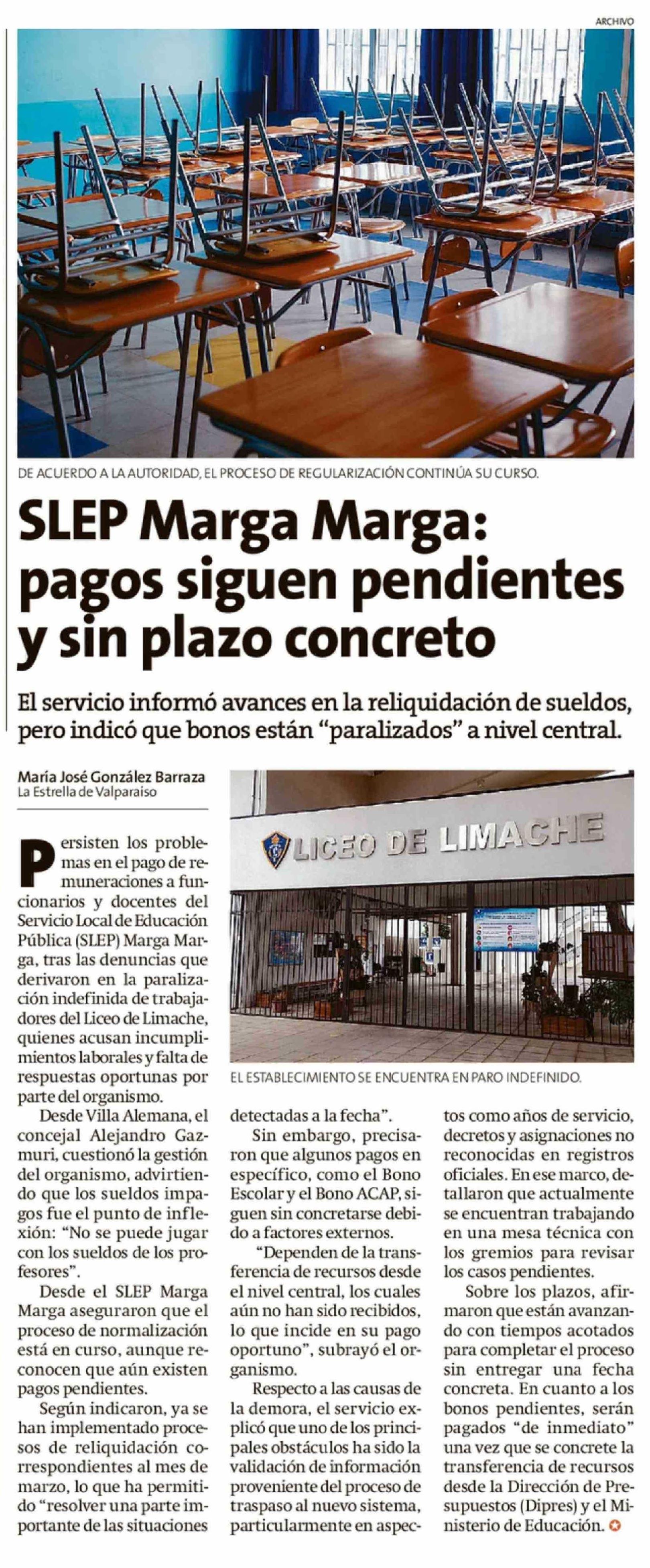 SLEP Marga Marga: pagos siguen pendientes y sin plazo concreto 16-04-2026 La Estrella de Valparaíso |