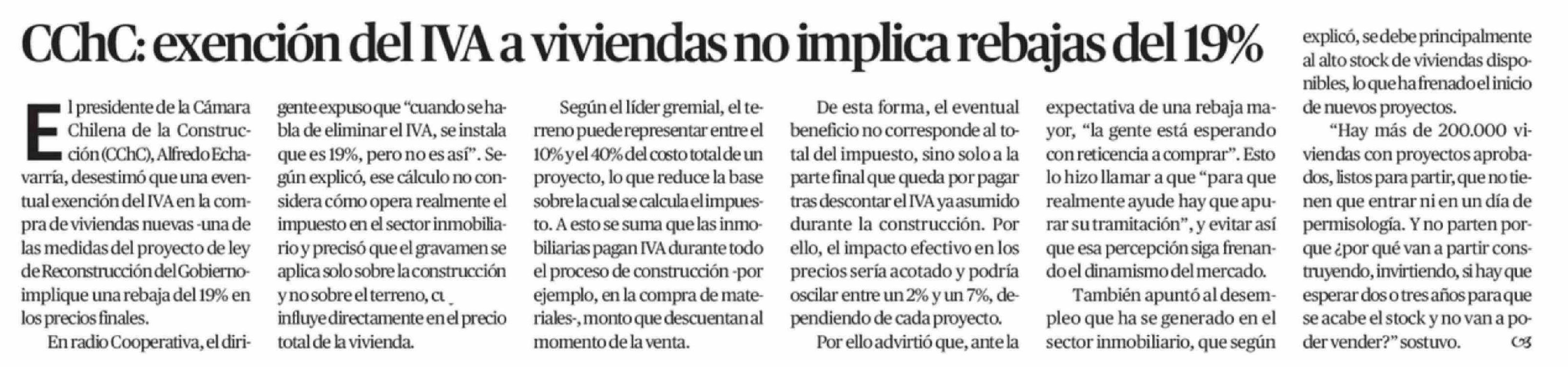 | Título: | CChC: exención del IVA a viviendas no implica rebajas del 19% |