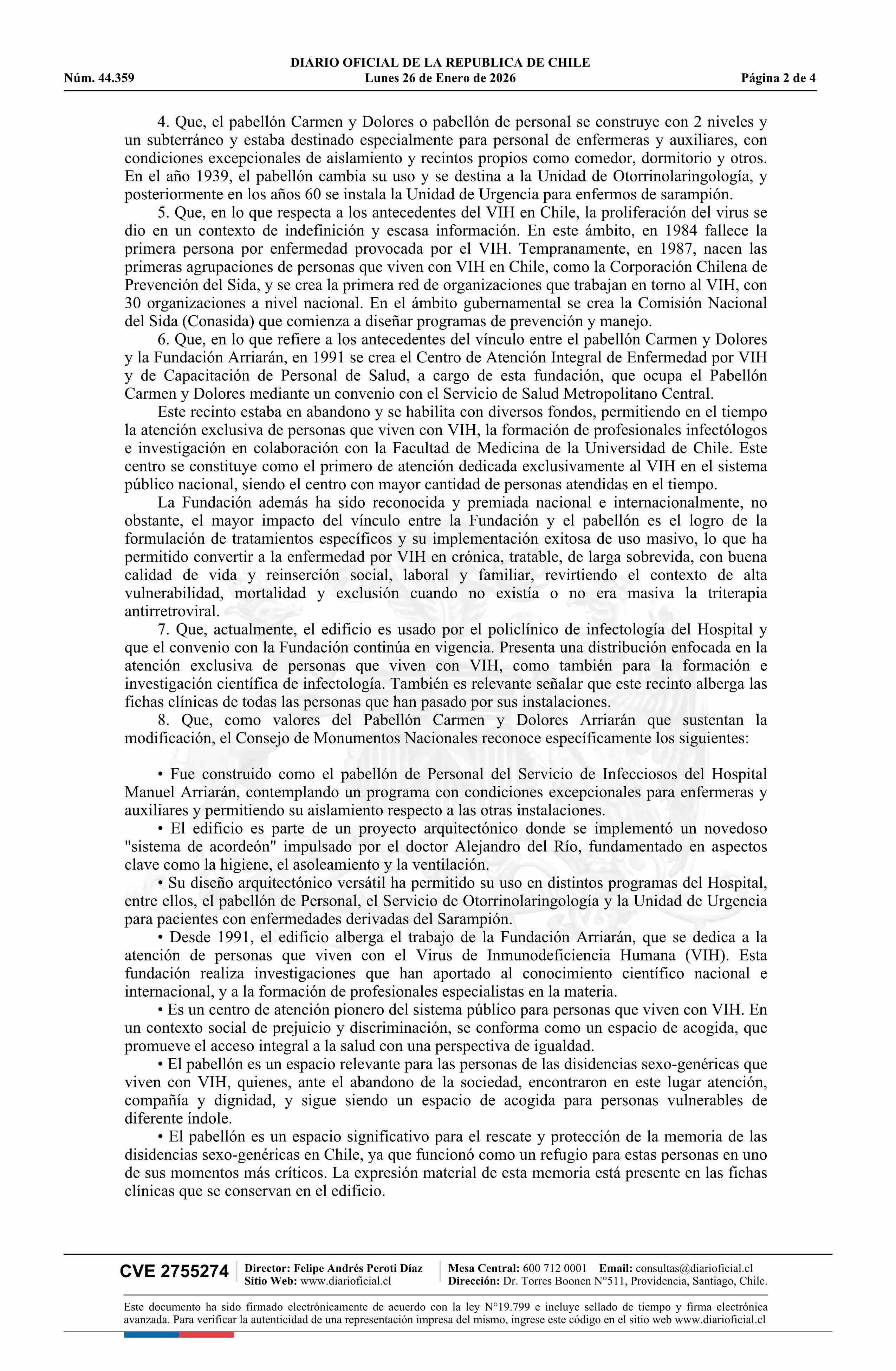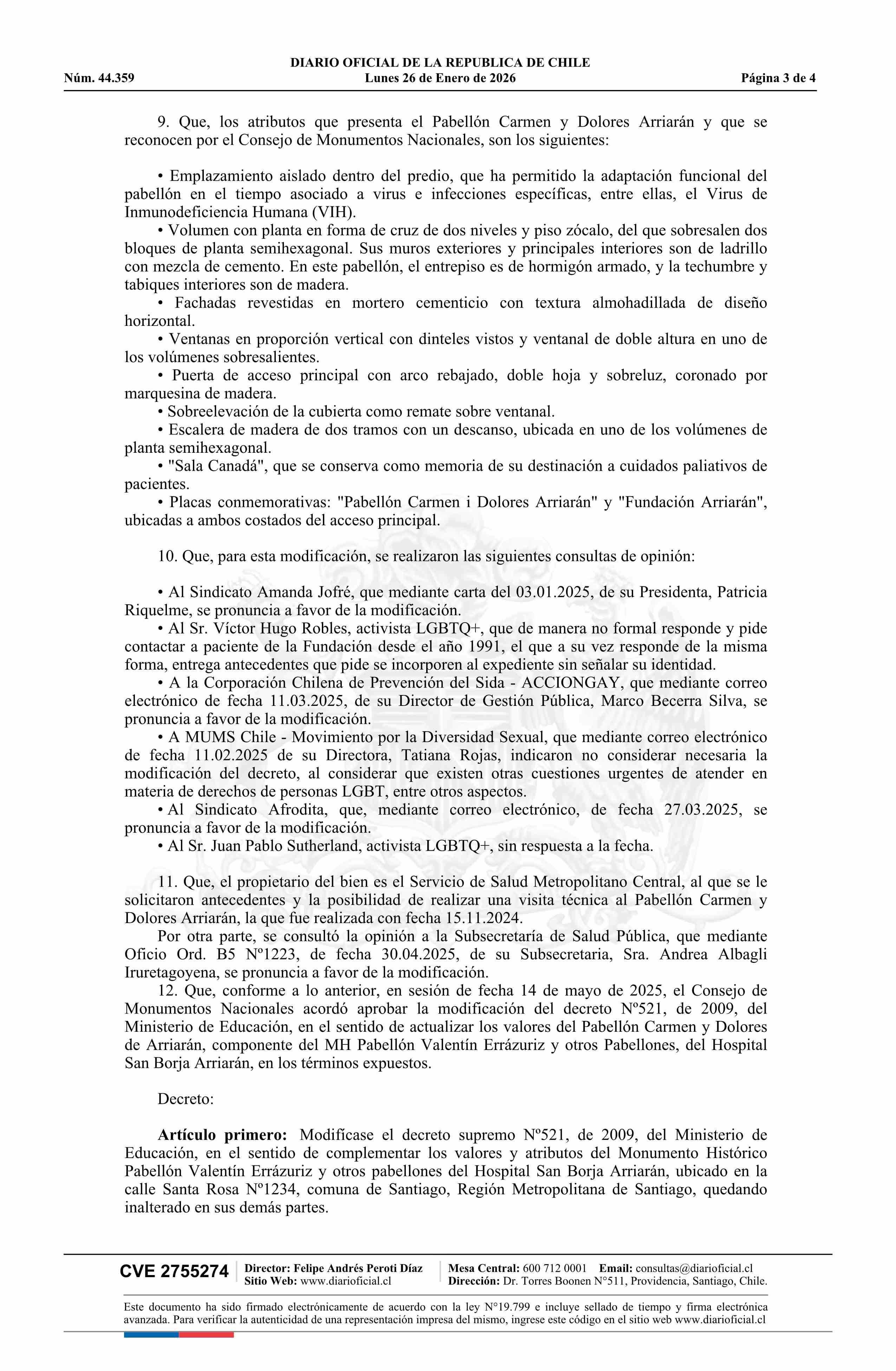 | Título: | Decreto exento número 3, de 2026.- Modifica decreto N° 521, de 2009, que declara monumento nacional en la categoría de Monumento Histórico El Pabellón Valentín Errázuriz y otros pabellones del Hospital San Borja Arriarán, comuna de Santiago, Región Metropolitana de Santiago |