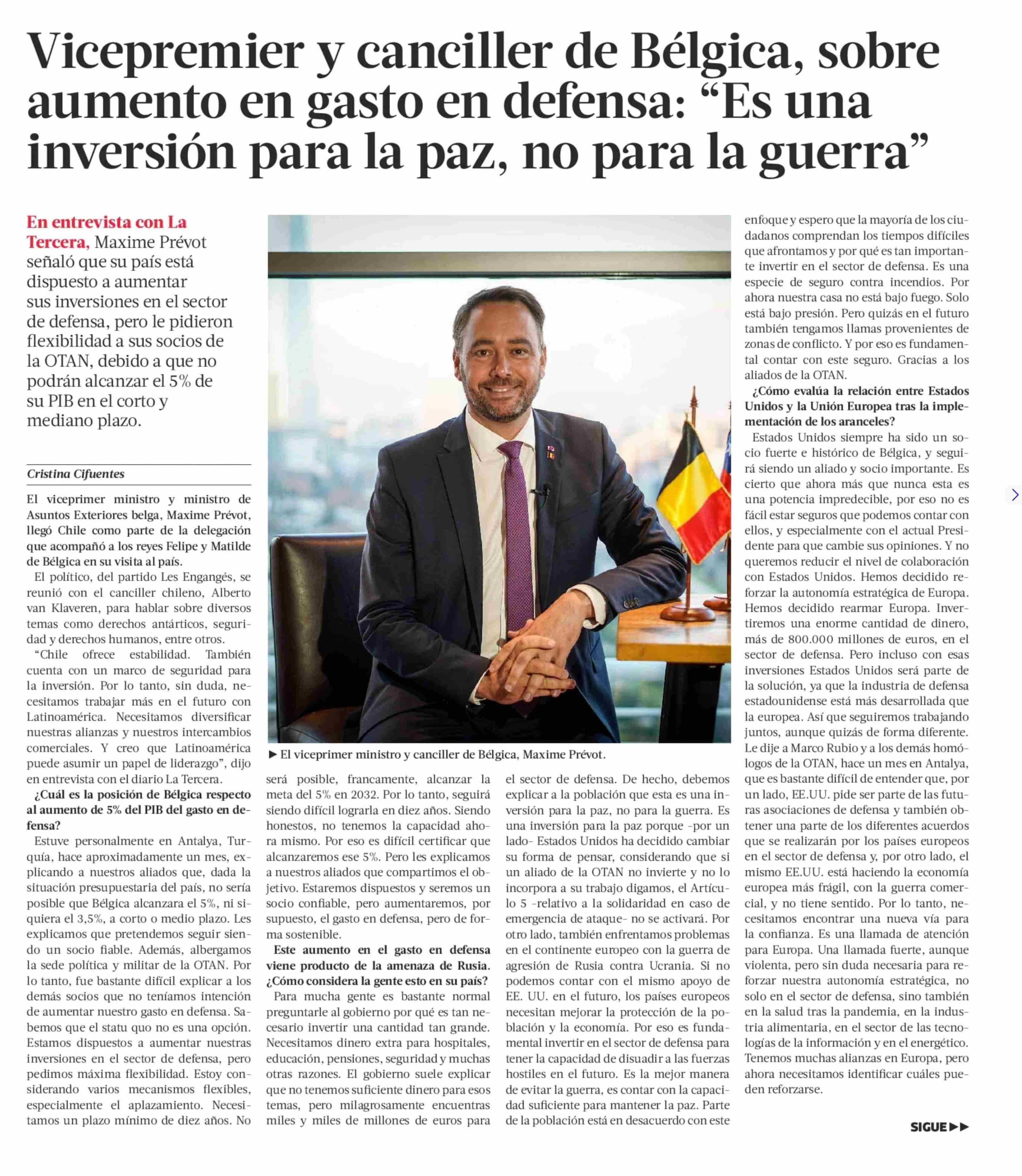 Vicepremier y canciller de Bélgica, sobre aumento en gasto en defensa: “Es una inversión para la paz, no para la guerra” 26-06-2025 La Tercera |
