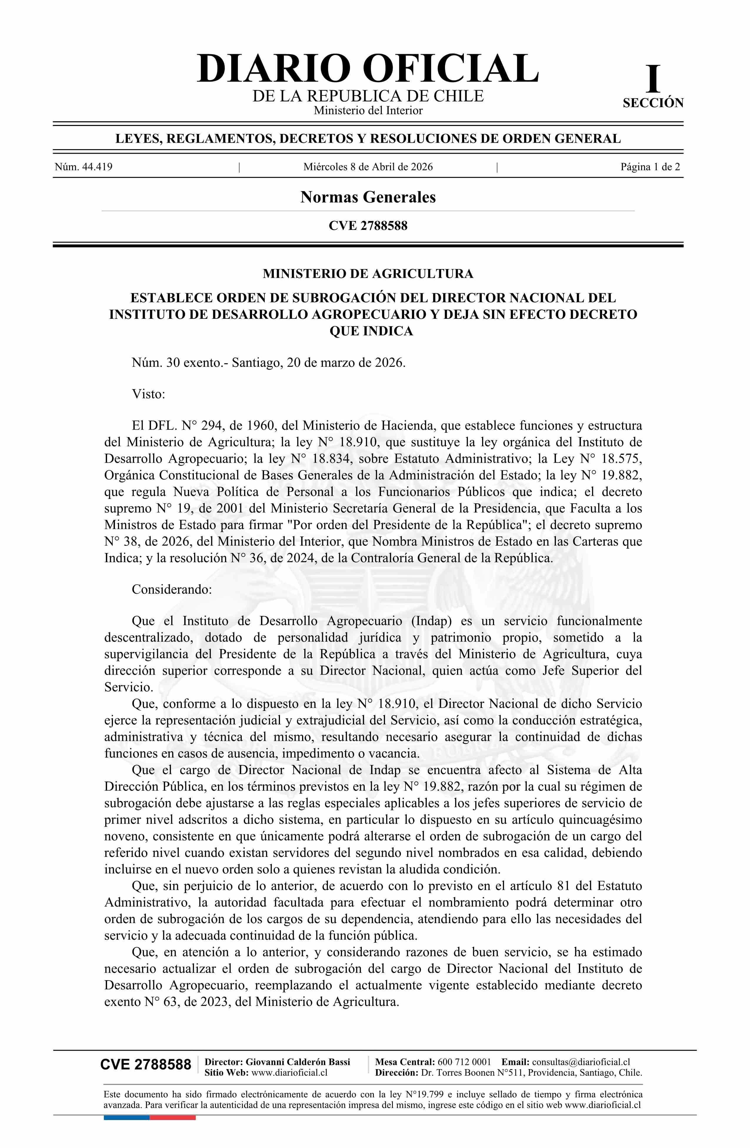 Título: Decreto exento número 30, de 2026.- Establece orden de subrogación del Director Nacional del Instituto de Desarrollo Agropecuario y deja sin efecto decreto N° 64 exento, de 2023