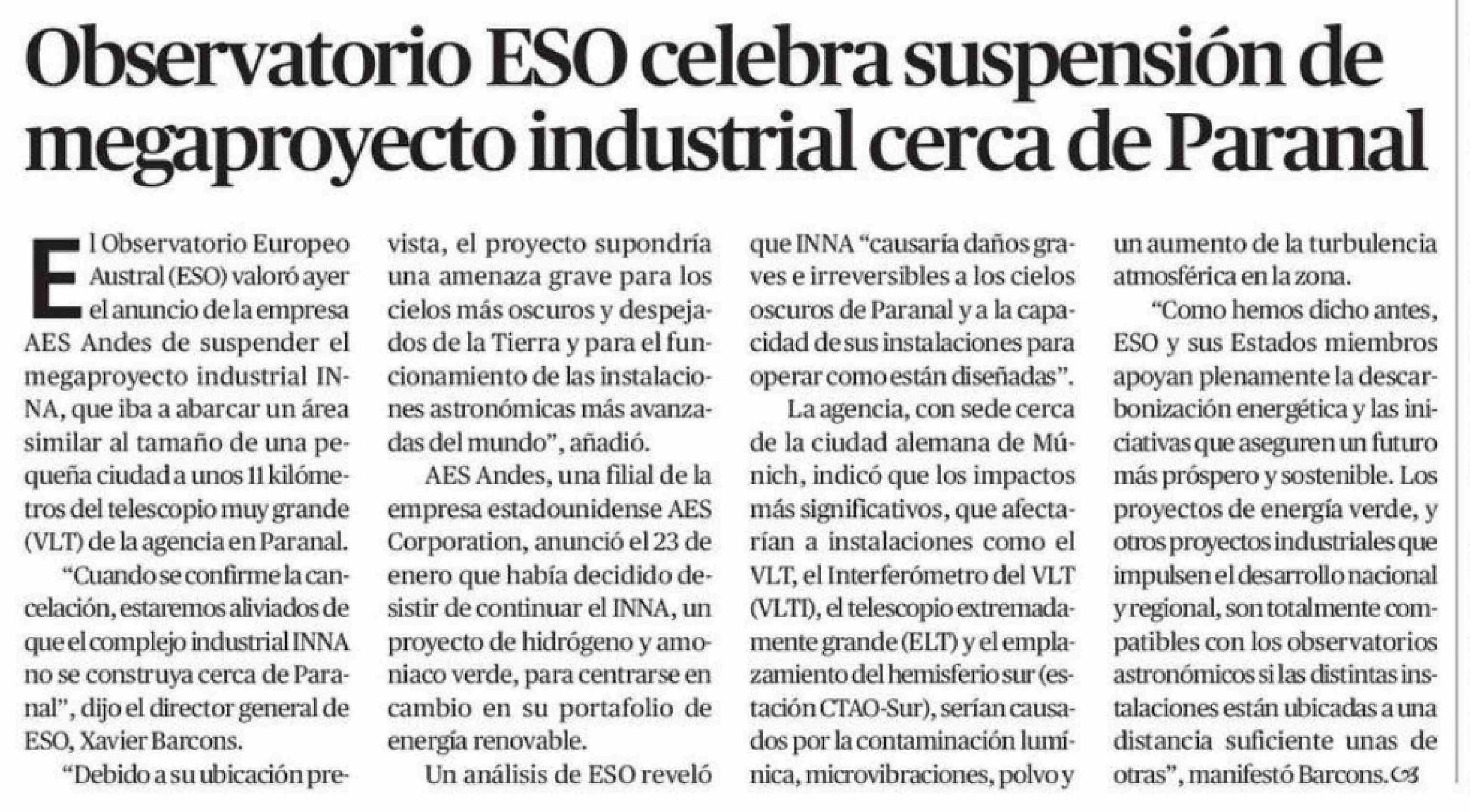 Título: Observatorio ESO celebra suspensión de megaproyecto industrial cerca de Paranal
