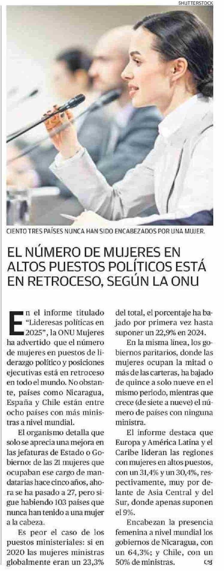 EL NÚMERO DE MUJERES EN ALTOS PUESTOS POLÍTICOS ESTÁ EN RETROCESO, SEGÚN LA ONU 24-06-2025 El Mercurio de Calama |