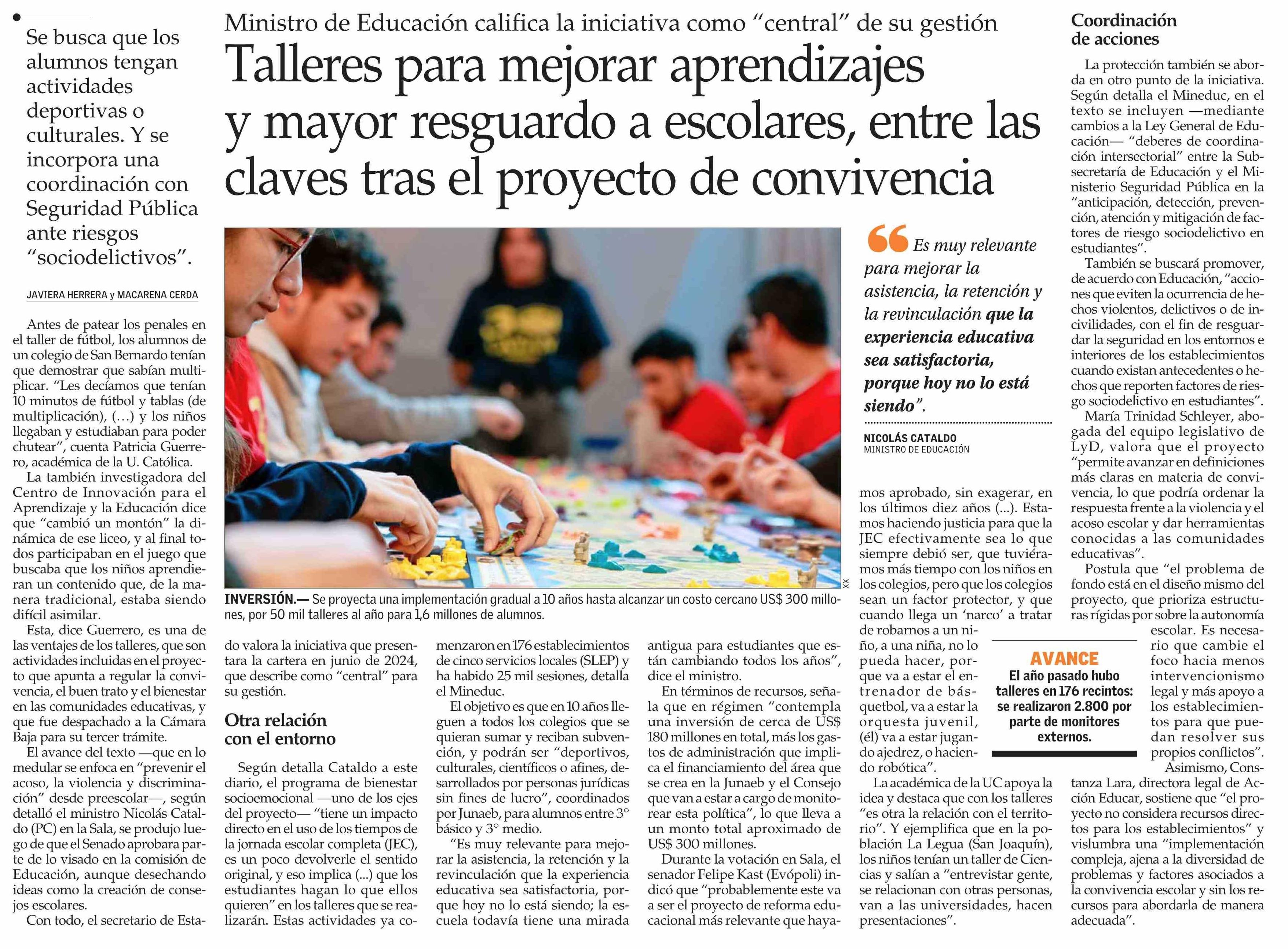 Talleres para mejorar aprendizajes y mayor resguardo a escolares, entre las claves tras el proyecto de convivencia 13-01-2026 El Mercurio |