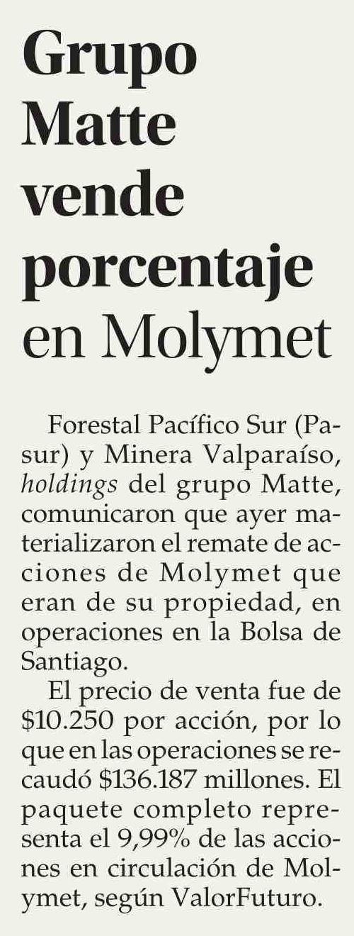 | Título: | Grupo Matte vende porcentaje en Molymet |