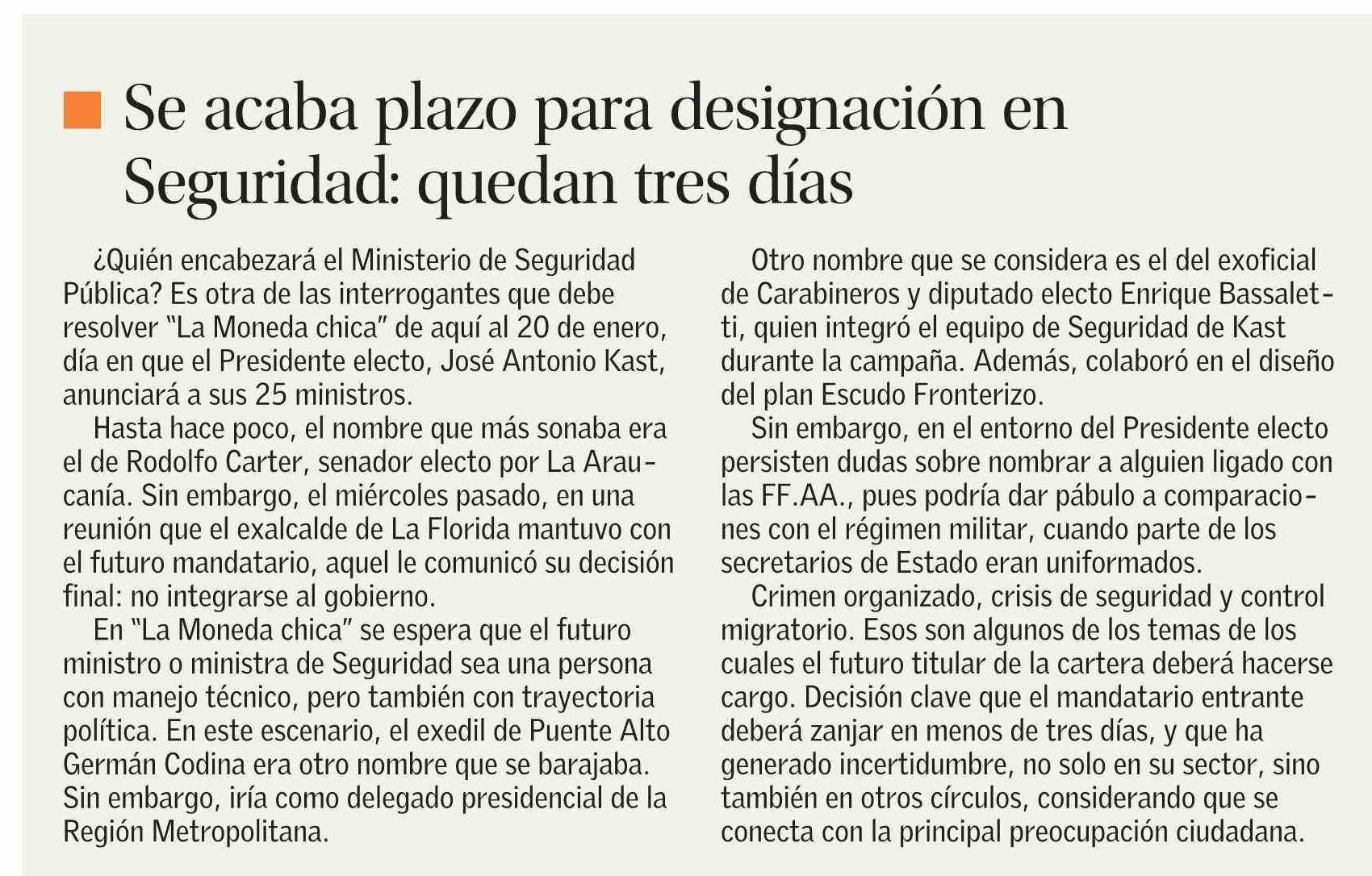 Título: Se acaba plazo para designación en Seguridad: quedan tres días