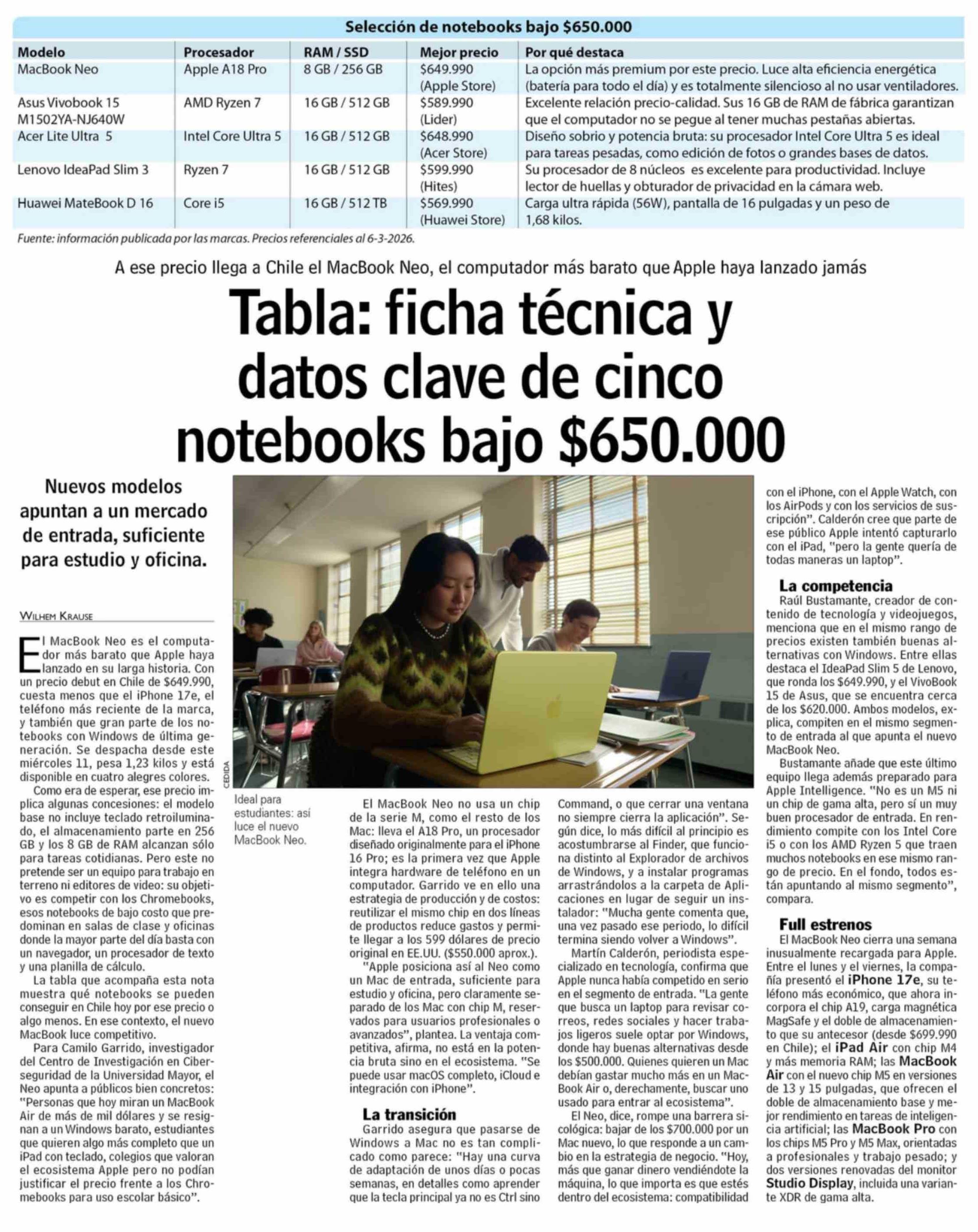 Tabla: ficha técnica y datos clave de cinco notebooks bajo $650.000