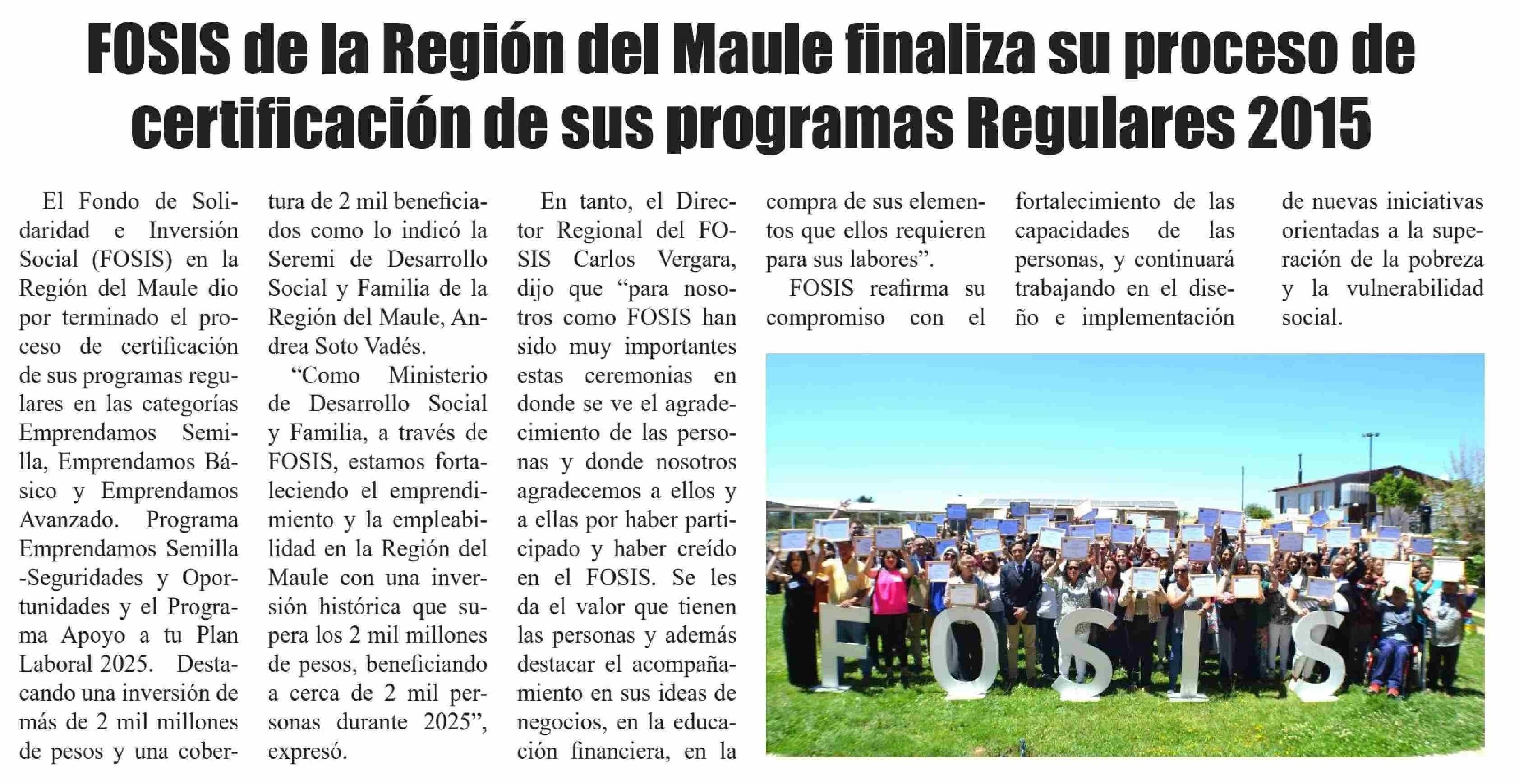 Título: FOSIS de la Región del Maule finaliza su proceso de certificación de sus programas Regulares 2015