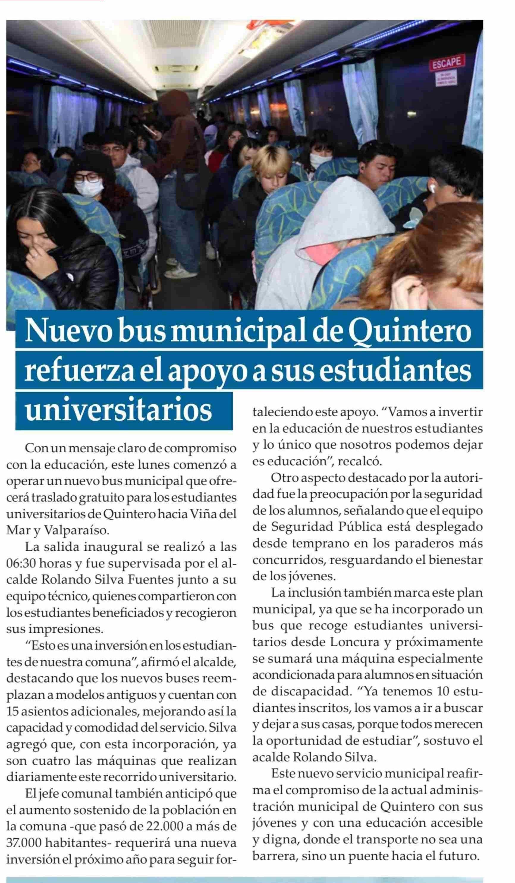 Nuevo bus municipal de Quintero refuerza el apoyo a sus estudiantes universitarios 08-04-2025 El Observador |