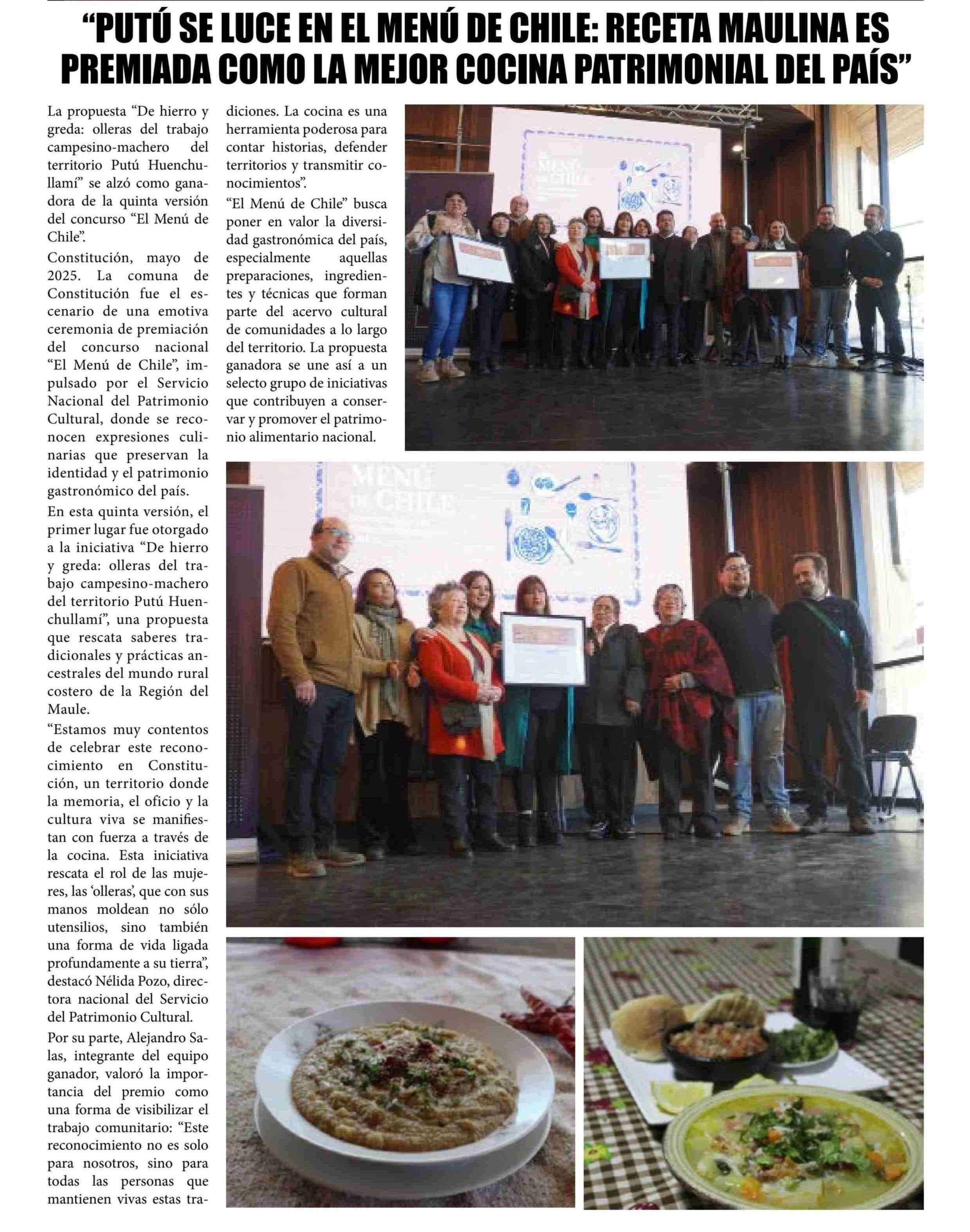 “PUTÓ SE LUCE EN El MENÚ DE CHILE: RECETA MAULINA ES PREMIADA COMO LA MEJOR COCINA PATRIMONIAL DEL PAÍS” 31-05-2025 El Lector |