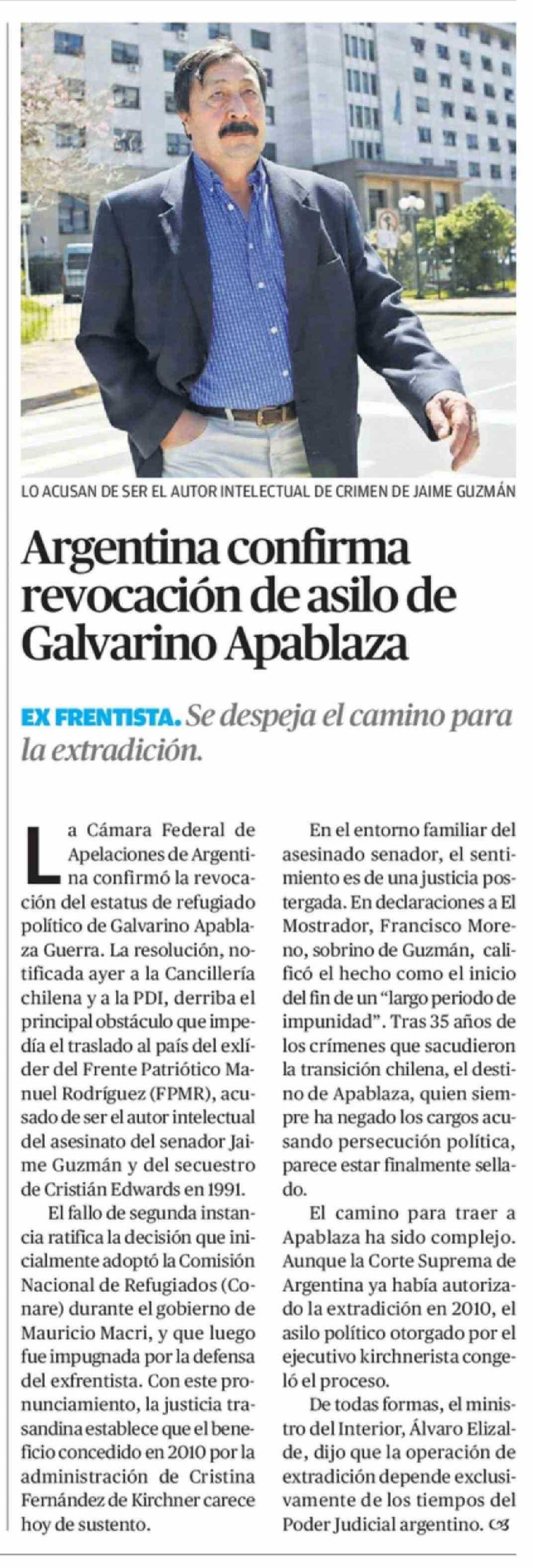Título: Argentina confirma revocación de asilo de Galvarino Apablaza