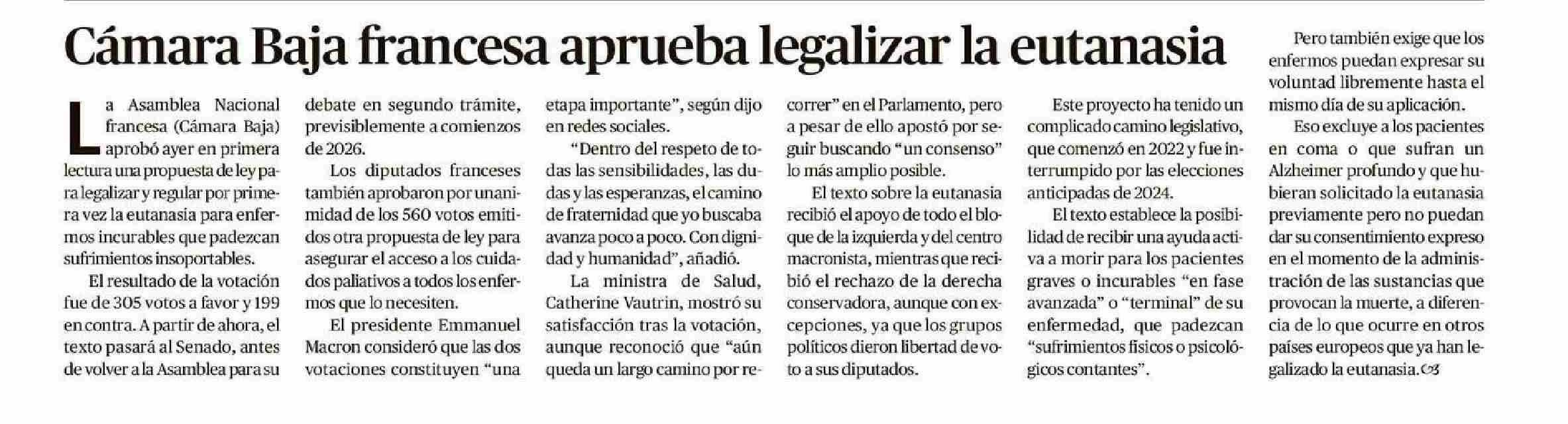 Cámara Baja francesa aprueba legalizar la eutanasia 28-05-2025 Crónica de Chillán |