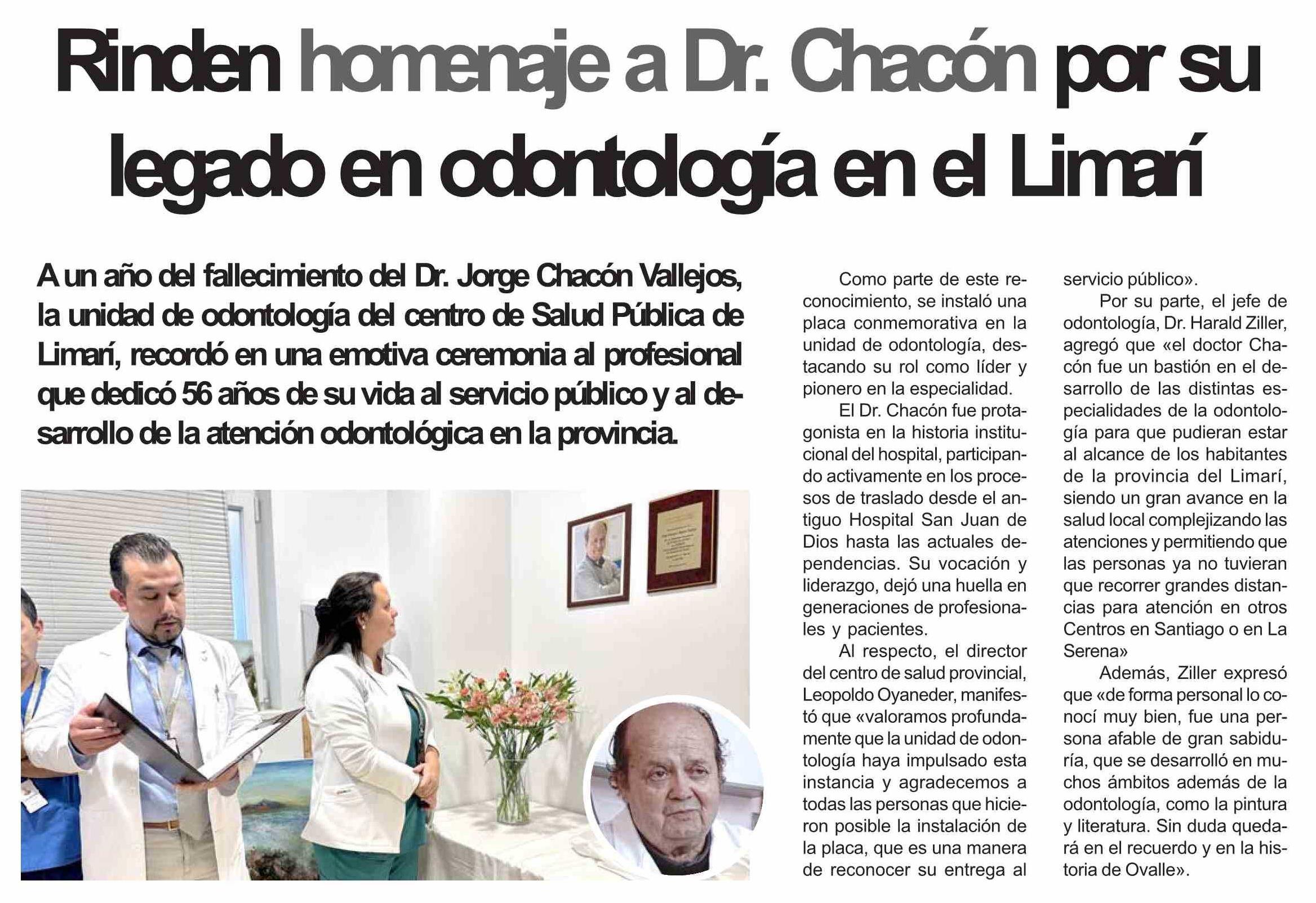 | Título: | Rinden homenaje a Dr. Chacón por su legado en odontología en el Limarí |