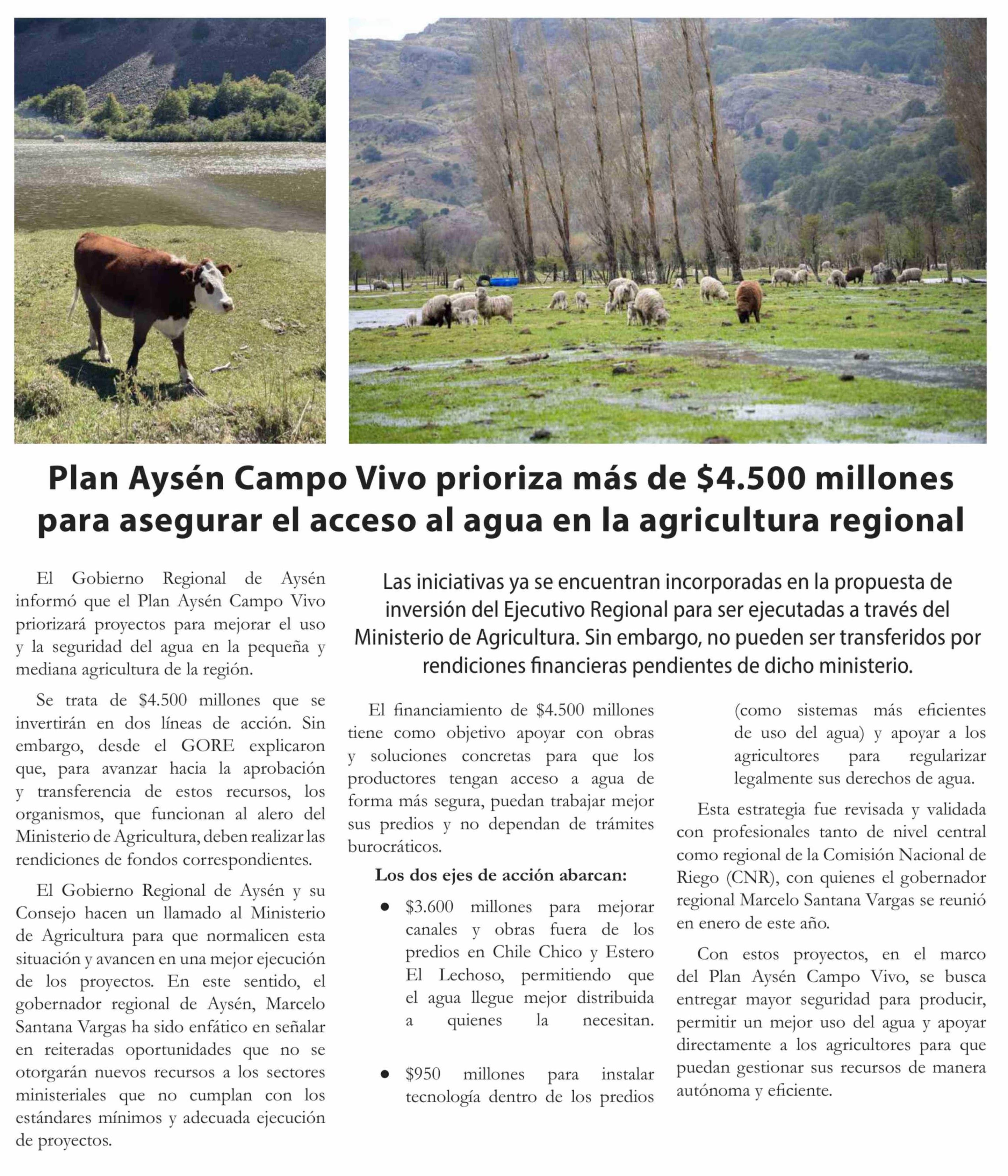 | Título: | Plan Aysén Campo Vivo prioriza más de $4.500 millones para asegurar el acceso al agua en la agricultura regional |