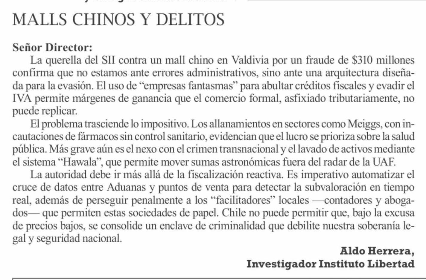 Cartas: MALLS CHINOS Y DELITOS 13-02-2026 El Pingüino |