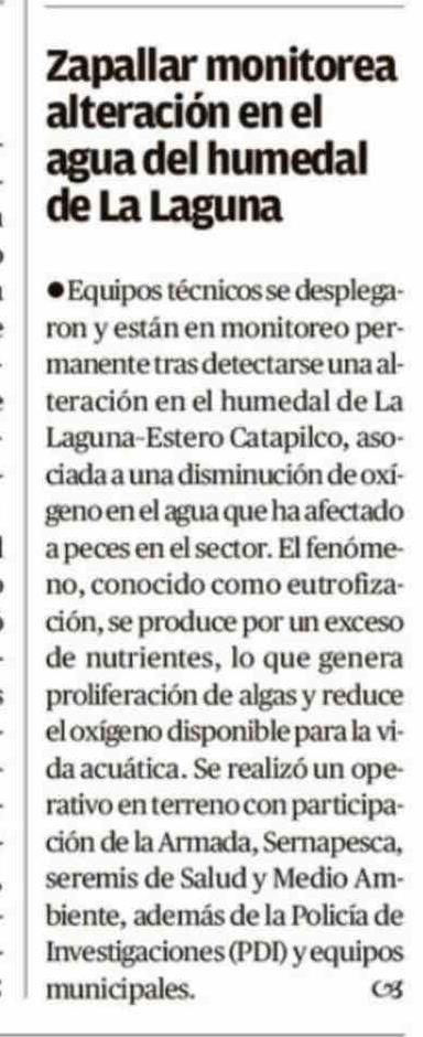 Zapallar monitorea alteración en el agua del humedal de La Laguna 13-04-2026 El Mercurio de Valparaíso |