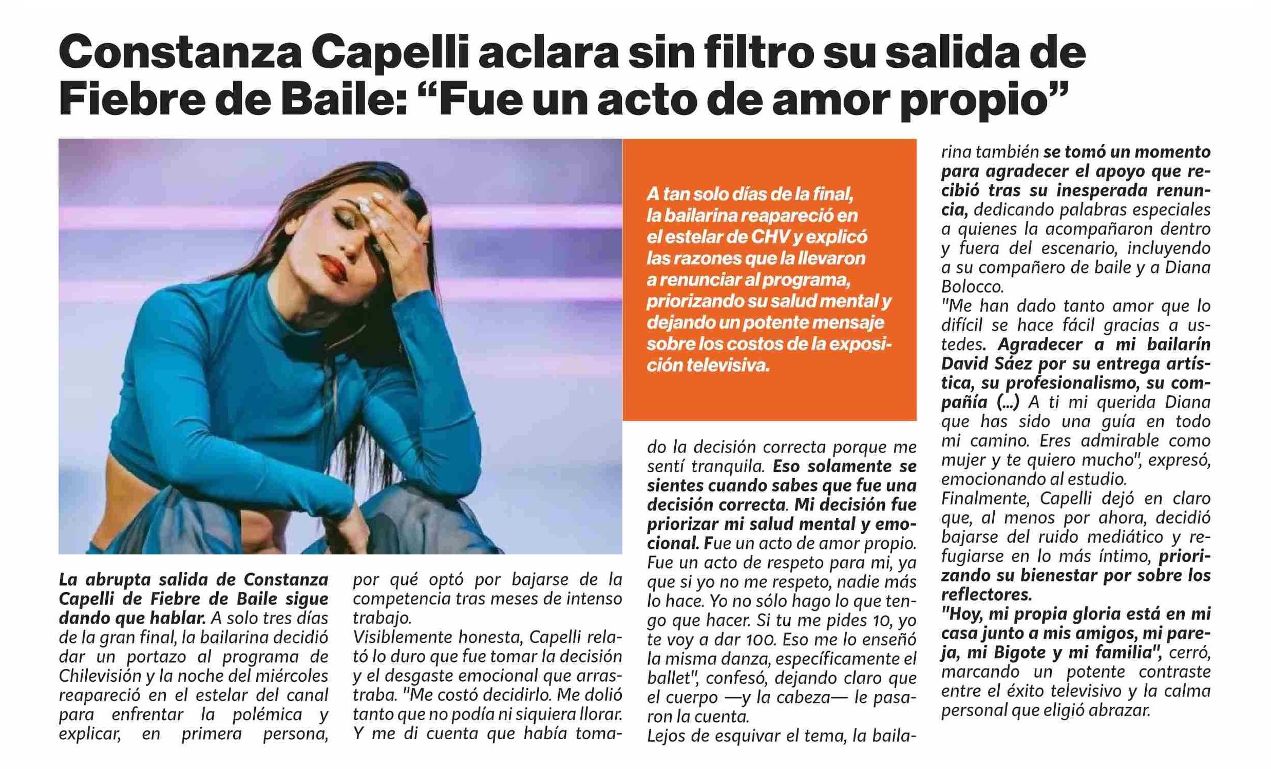 Título: Constanza Capelli aclara sin filtro su salida de Fiebre de Baile: “Fue un acto de amor propio”
