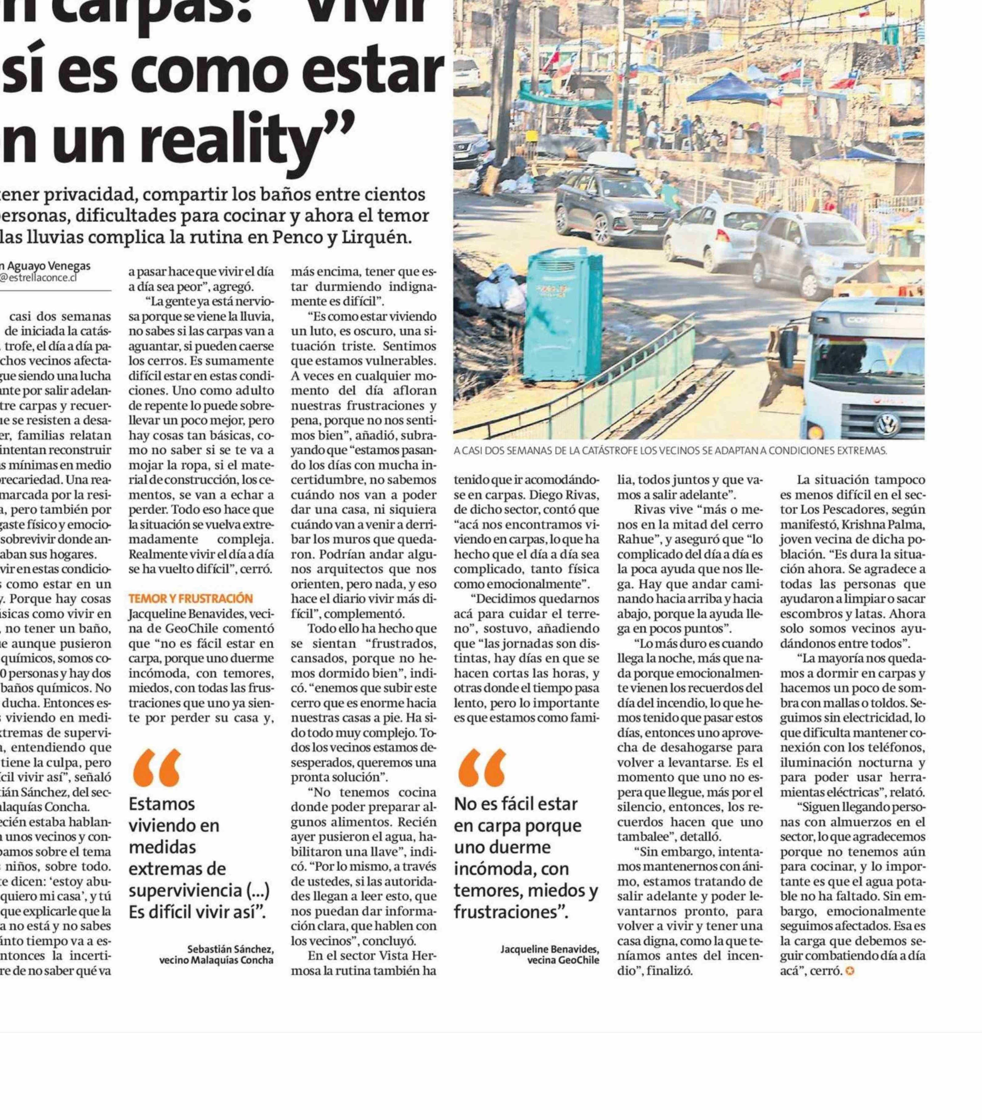 El duro día a día de los afectados en carpas: "Vivir así es como estar en un reality" 30-01-2026 La Estrella de Concepción |