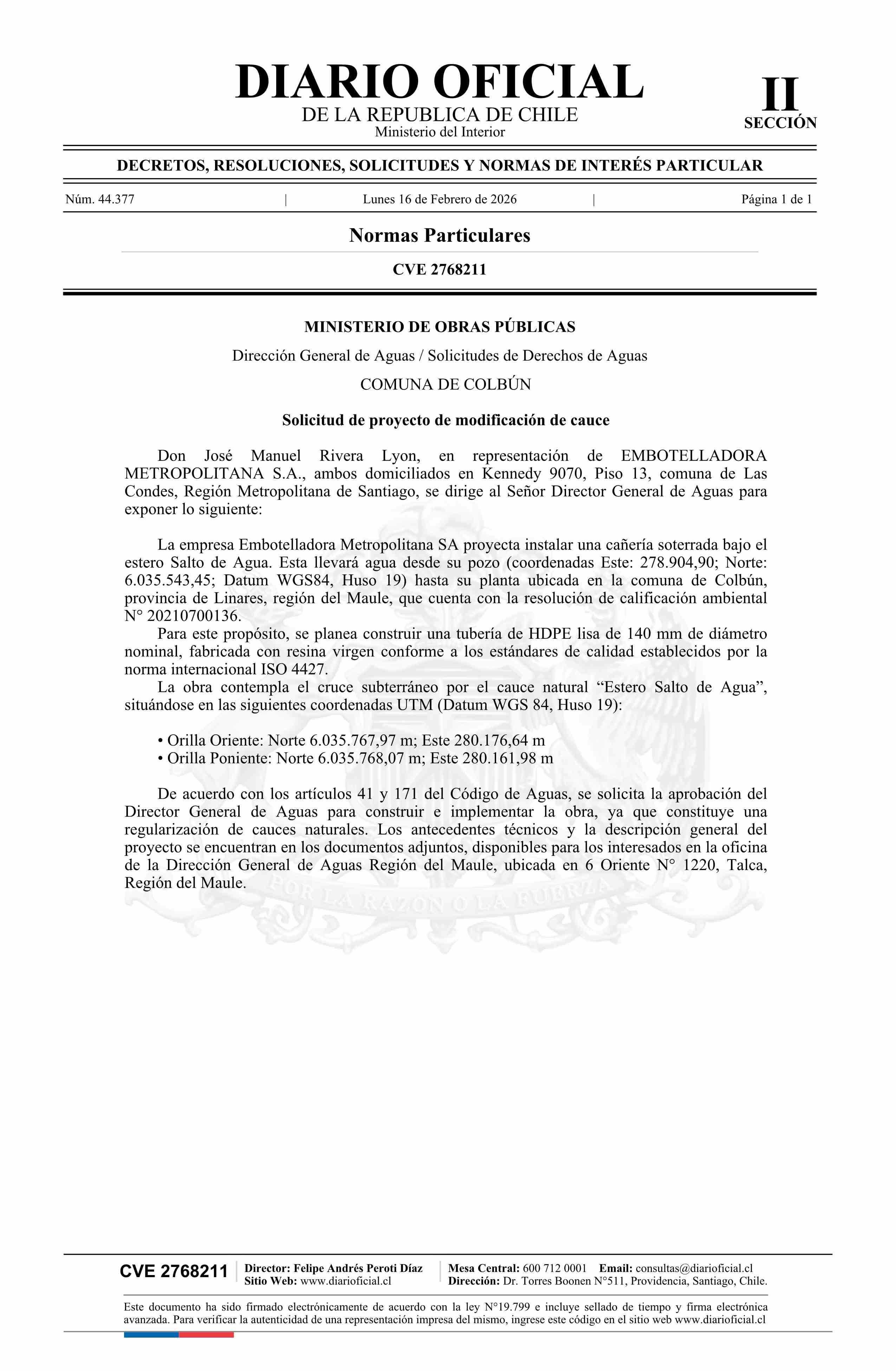 Fuente: Diario Oficial Edición Electrónica (Diario Oficial de Chile - 2 Normas Particulares) Página(s): 168