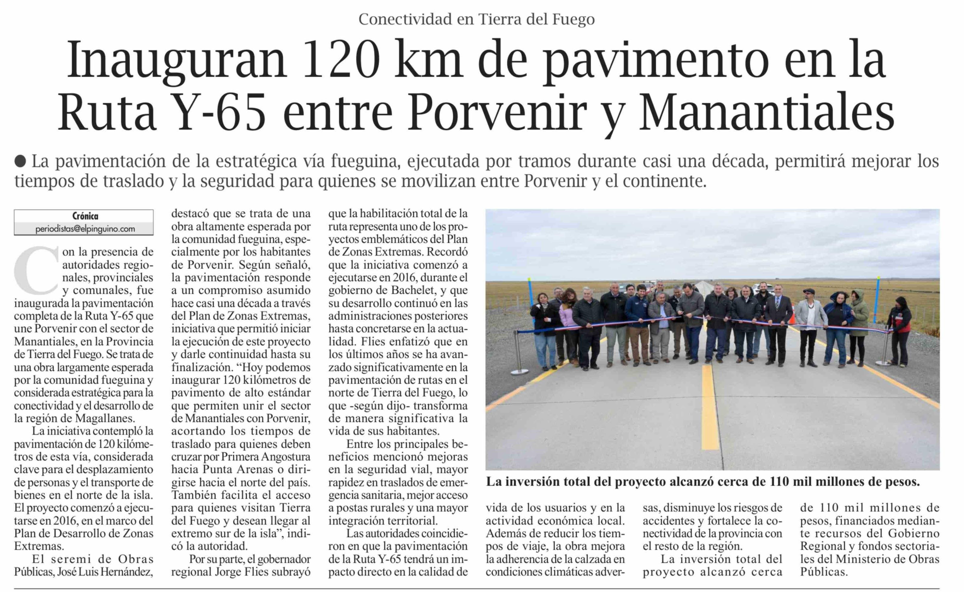 Título: Inauguran 120 km de pavimento en la Ruta Y-65 entre Porvenir y Manantiales