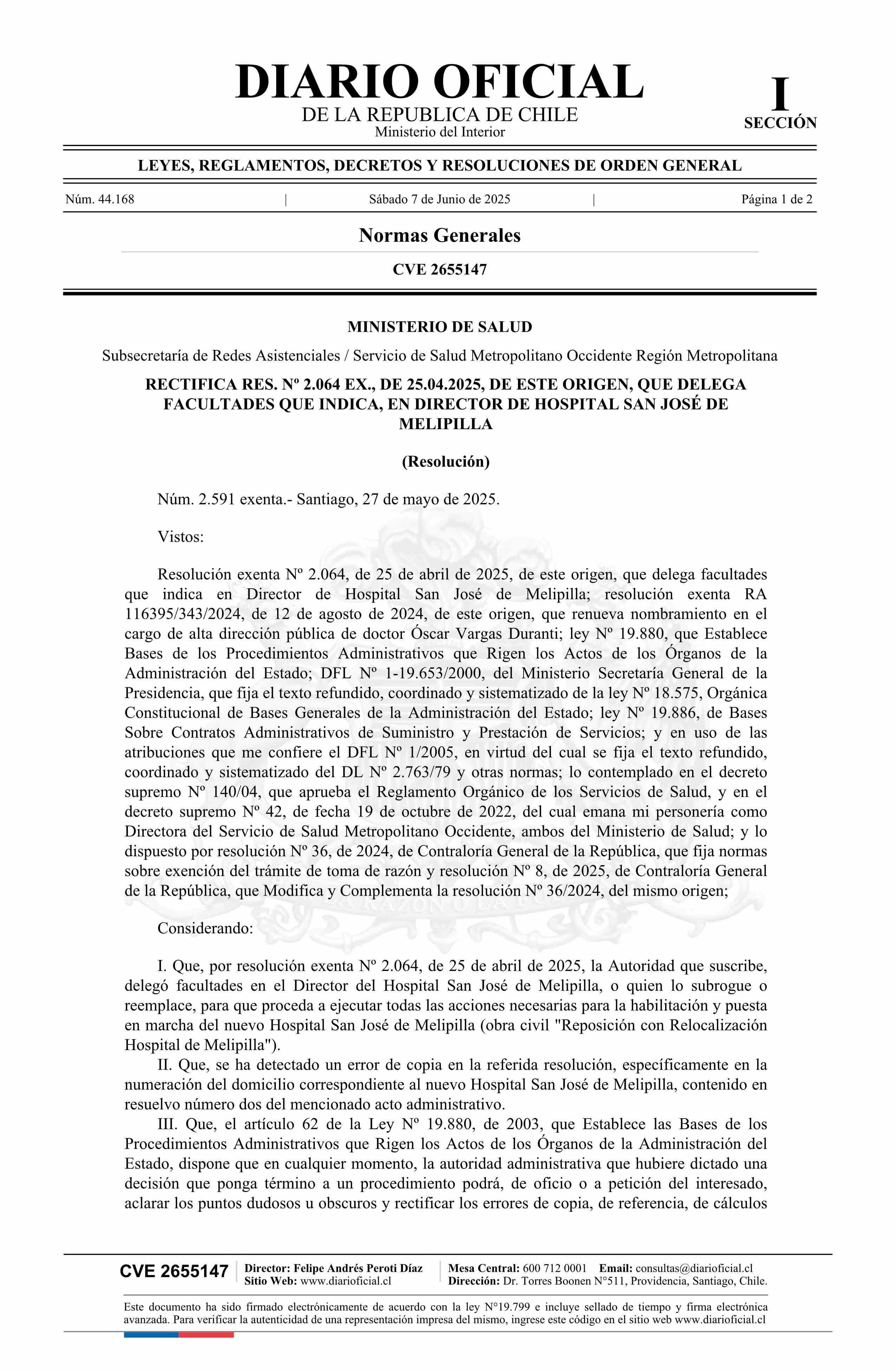Título: Resolución exenta número 2.591, de 2025.- Rectifica resolución Nº 2.064 exenta, 2025, que delega facultades que indica, en Director de Hospital San José de Melipilla