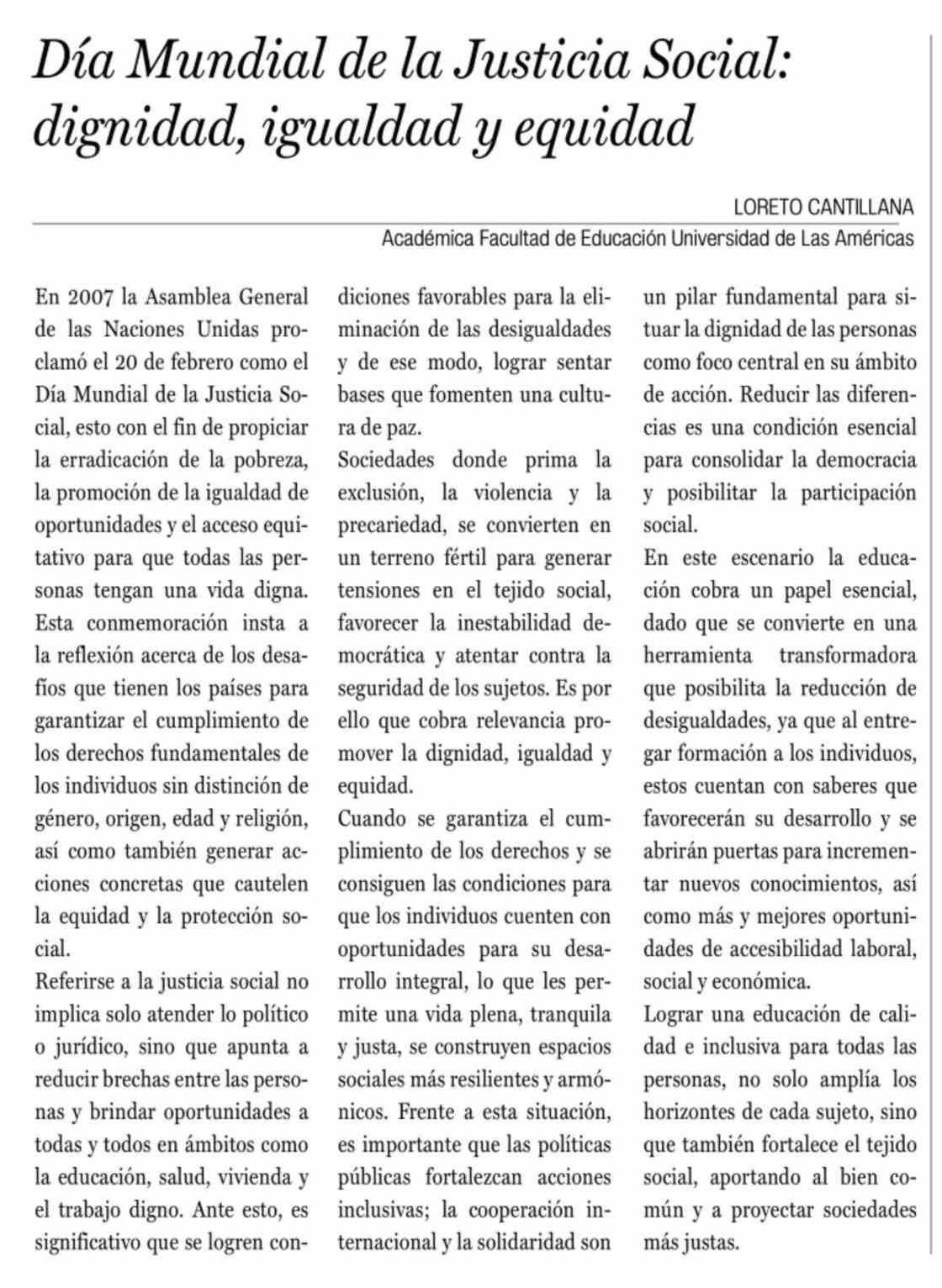 Título: Columnas de Opinión: Día Mundial de la Justicia Social: dignidad, igualdad y equidad