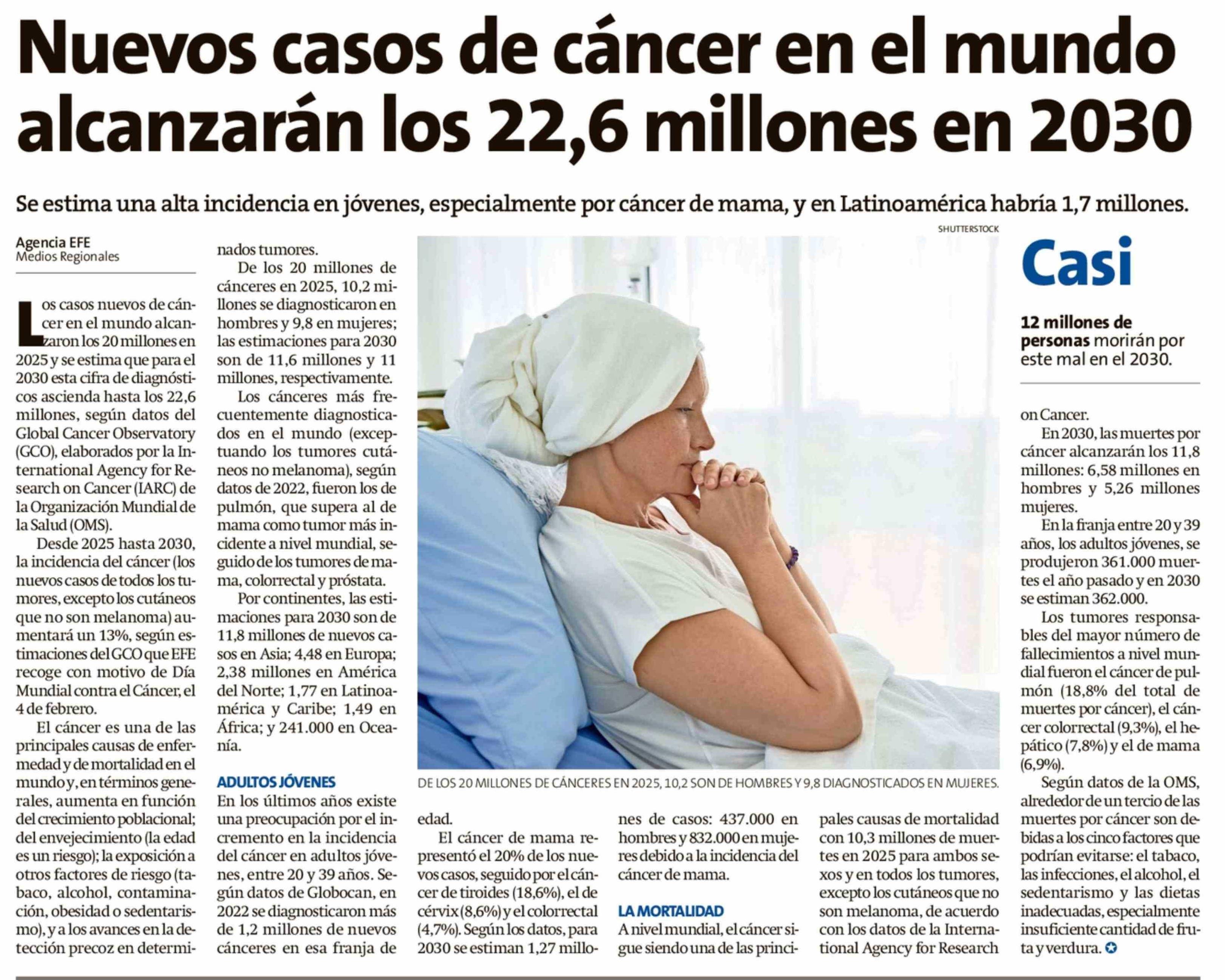 Nuevos casos de cáncer en el mundo alcanzarán los 22,6 millones en 2030 06-02-2026 La Estrella de Chiloé |