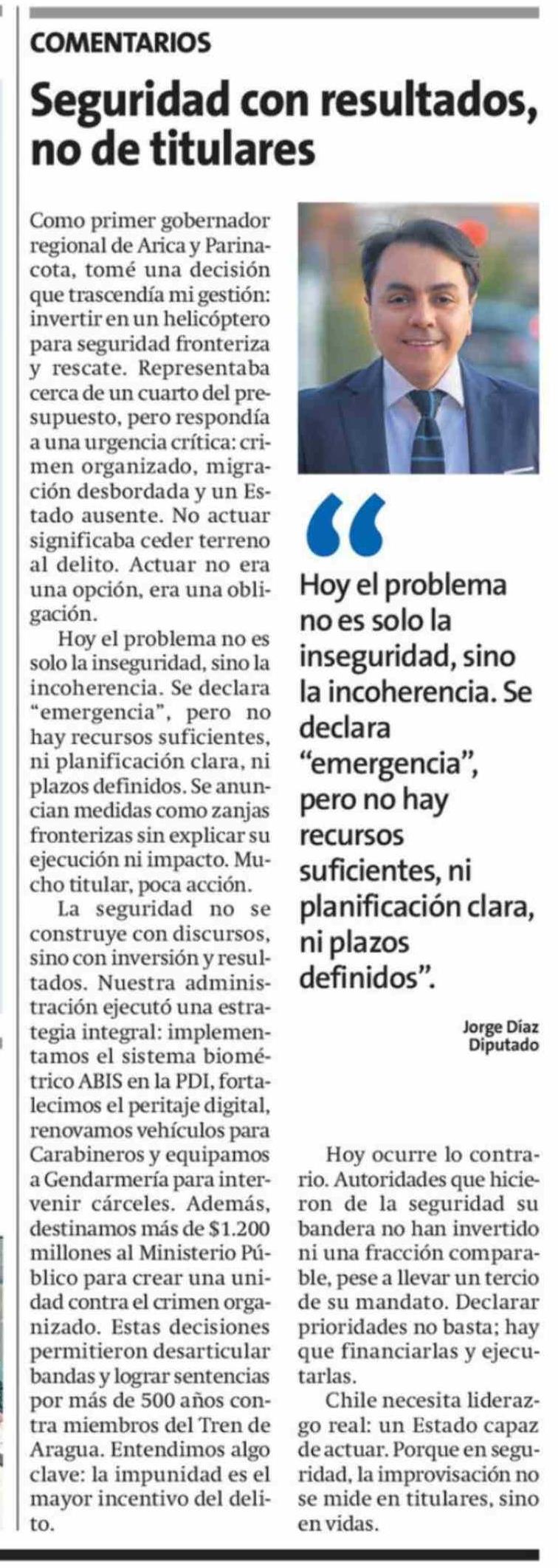Columnas de Opinión: Seguridad con resultados, no de titulares 08-04-2026 La Estrella de Arica |