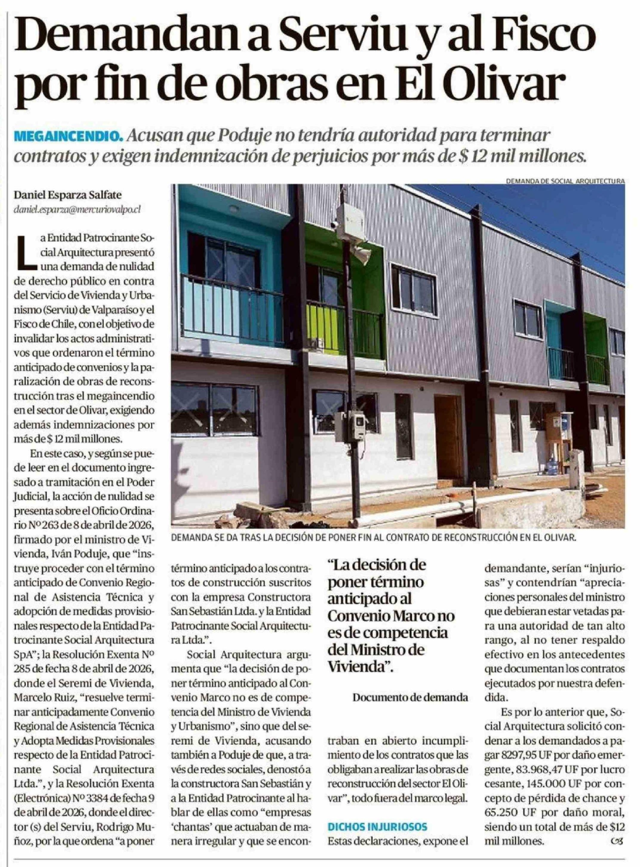 Demandan a Serviu y al Fisco por fin de obras en El Olivar 27-04-2026 El Mercurio de Valparaíso |