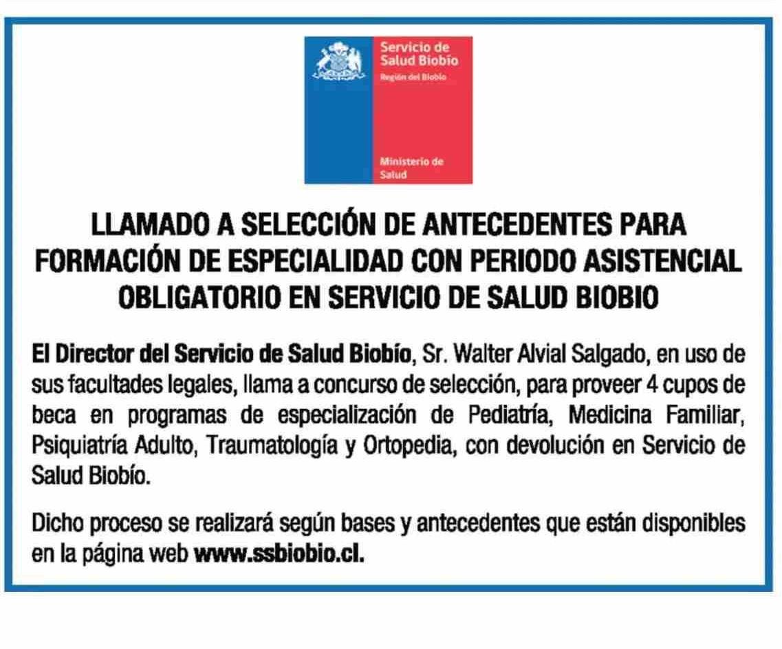 EXTRACTOS: LLAMADO A SELECCIÓN DE ANTECEDENTES PARA FORMACIÓN DE ESPECIALIDAD CON PERIODO ASISTENCIAL OBLIGATORIO EN SERVICIO DE SALUD BIOBIO