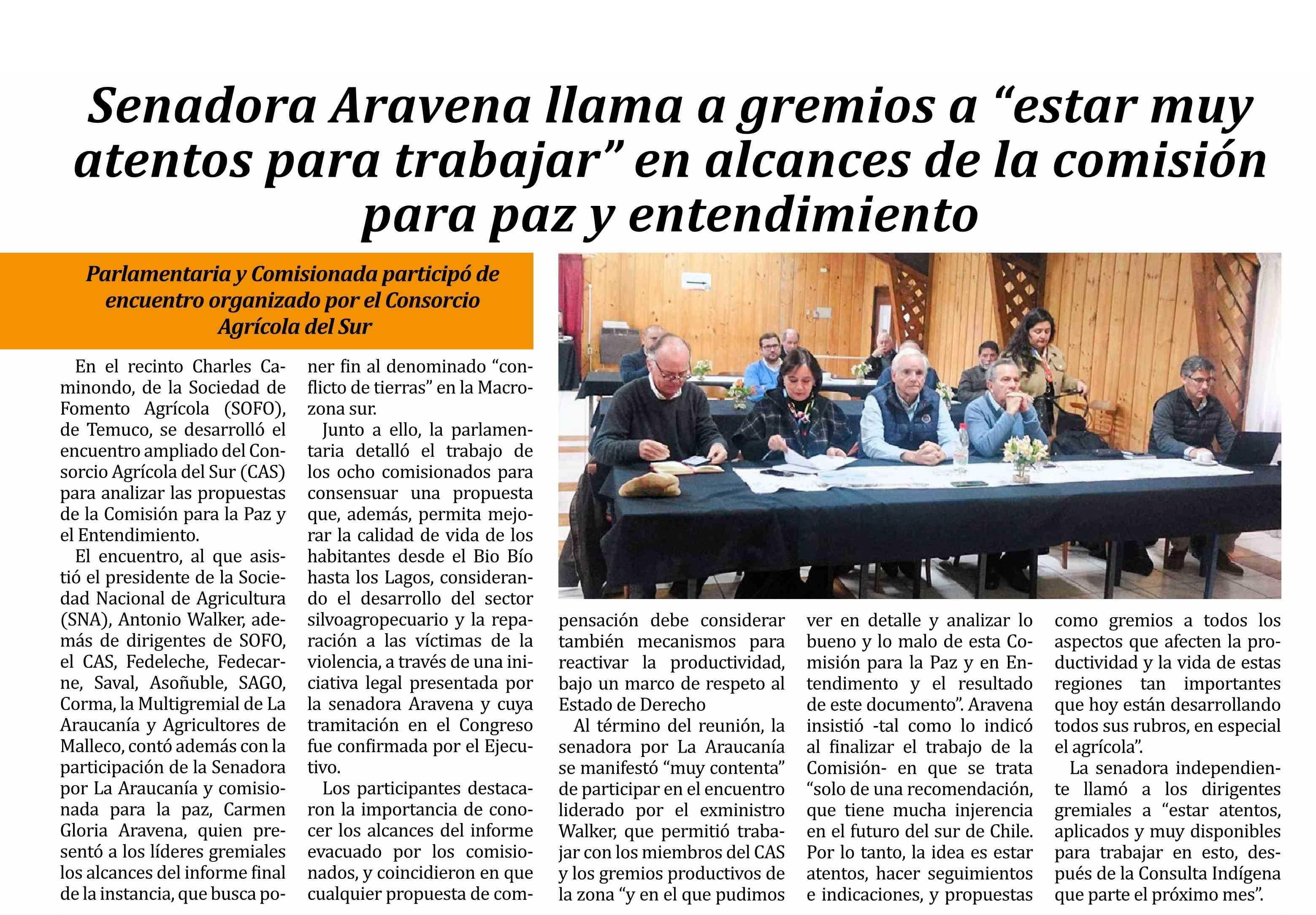 Título: Senadora Aravena llama a gremios a “estar muy atentos para trabajar” en alcances de la comisión para paz y entendimiento