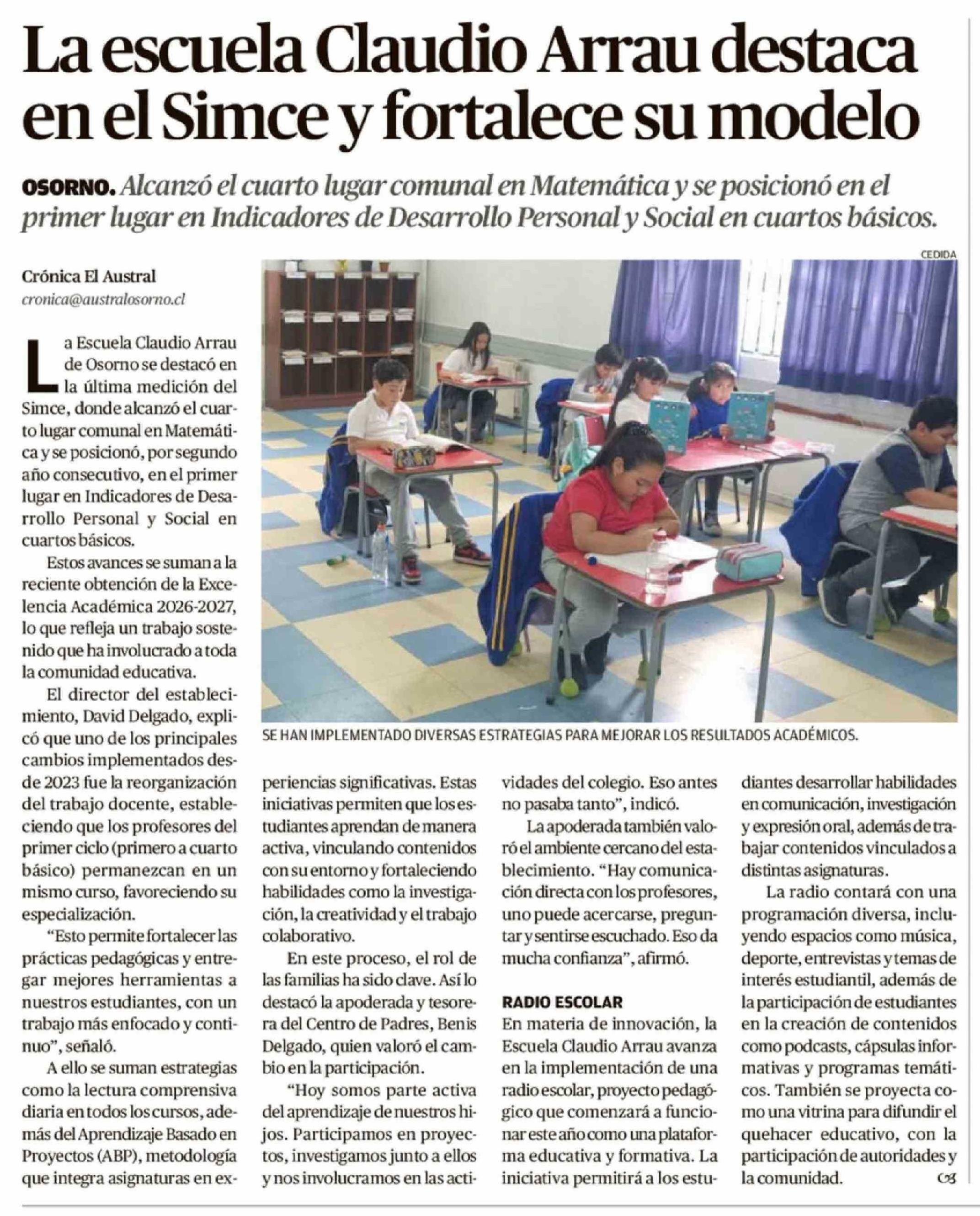 La escuela Claudio Arrau destaca en el Simce y fortalece su modelo 24-03-2026 El Austral de Osorno |
