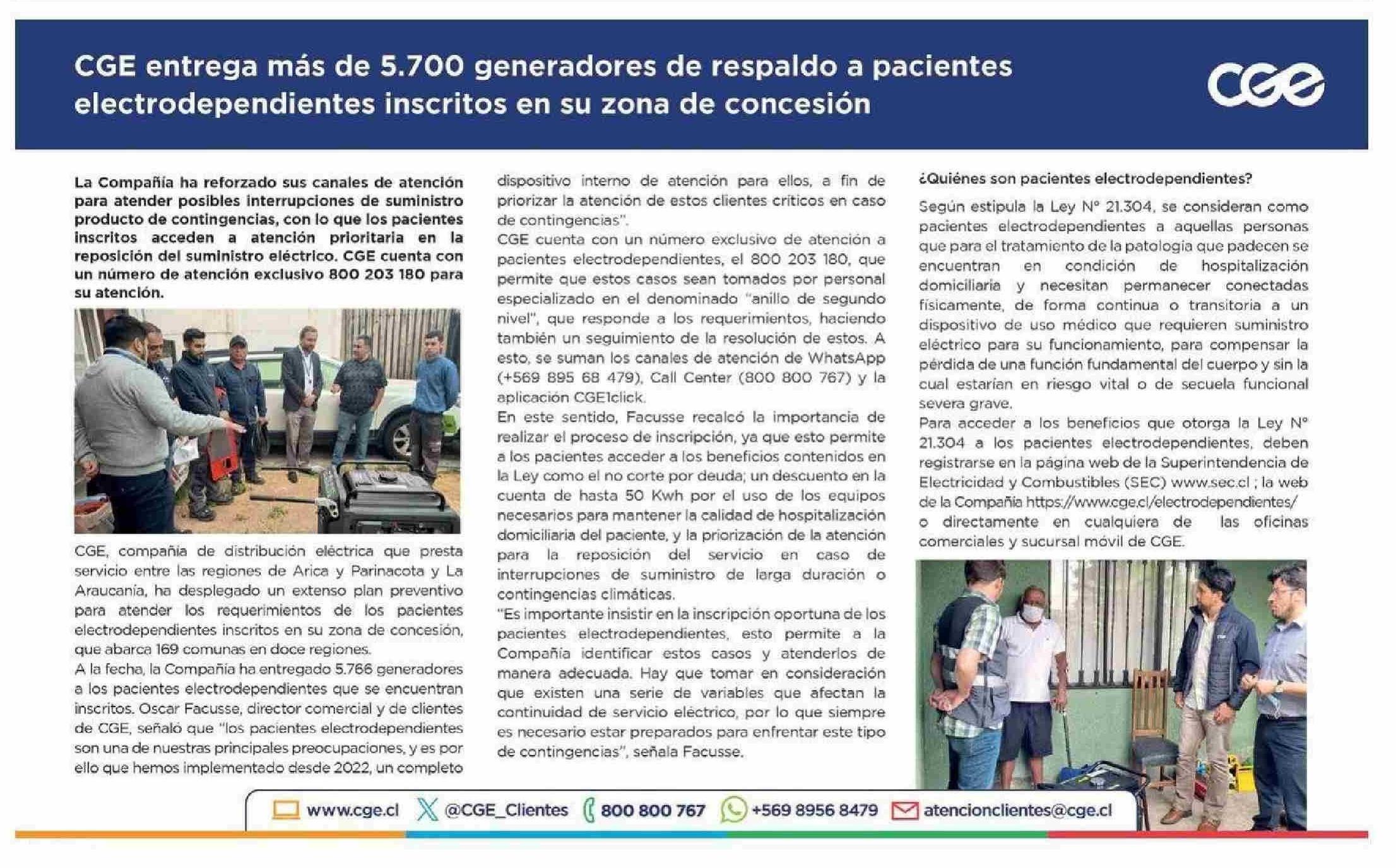 CGE entrega más de 5.700 generadores de respaldo a pacientes electrodependientes inscritos en su zona de concesión 27-05-2025 El Diario de Atacama |