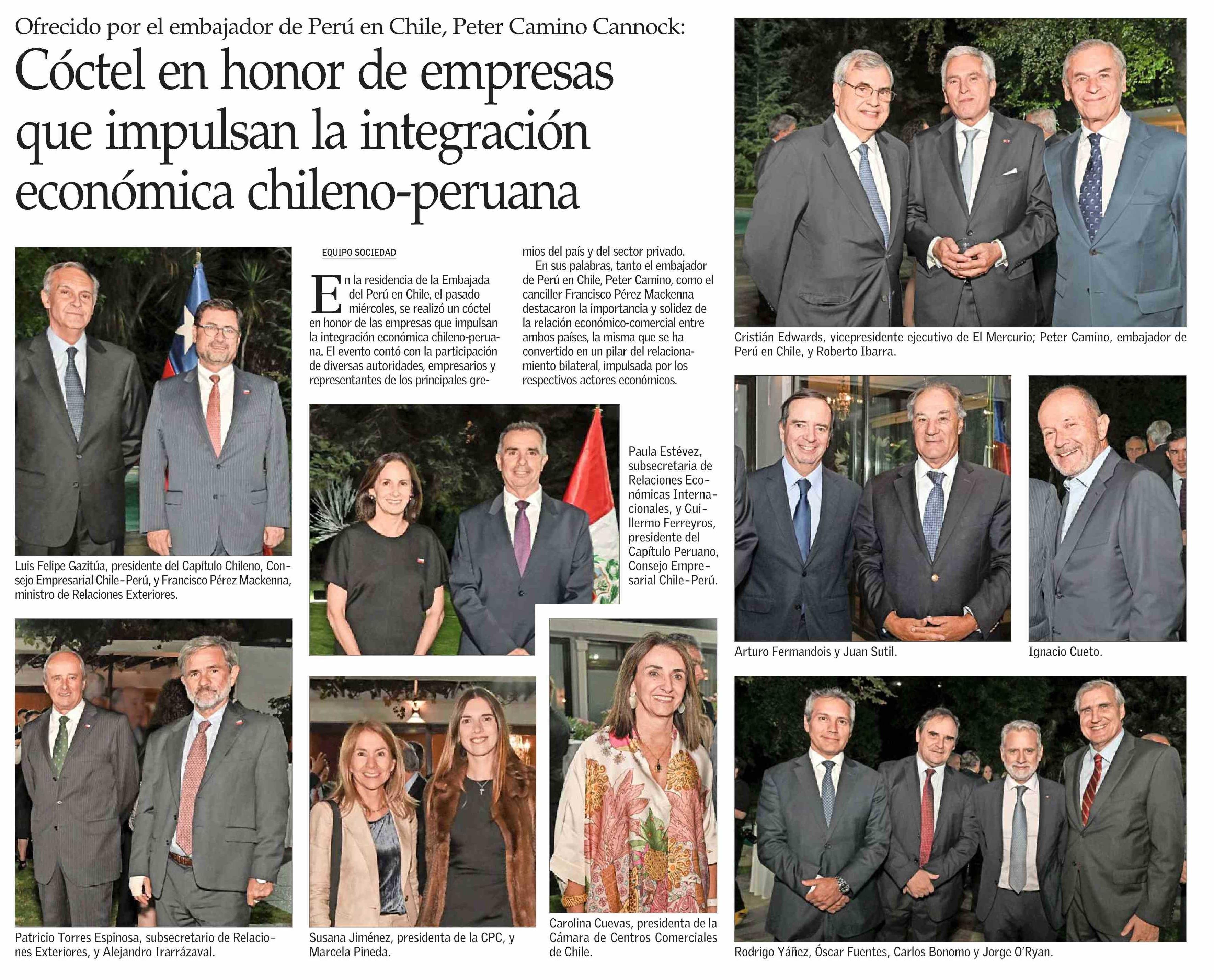 Cóctel en honor de empresas que impulsan la integración económica chileno-peruana 14-04-2026 El Mercurio |