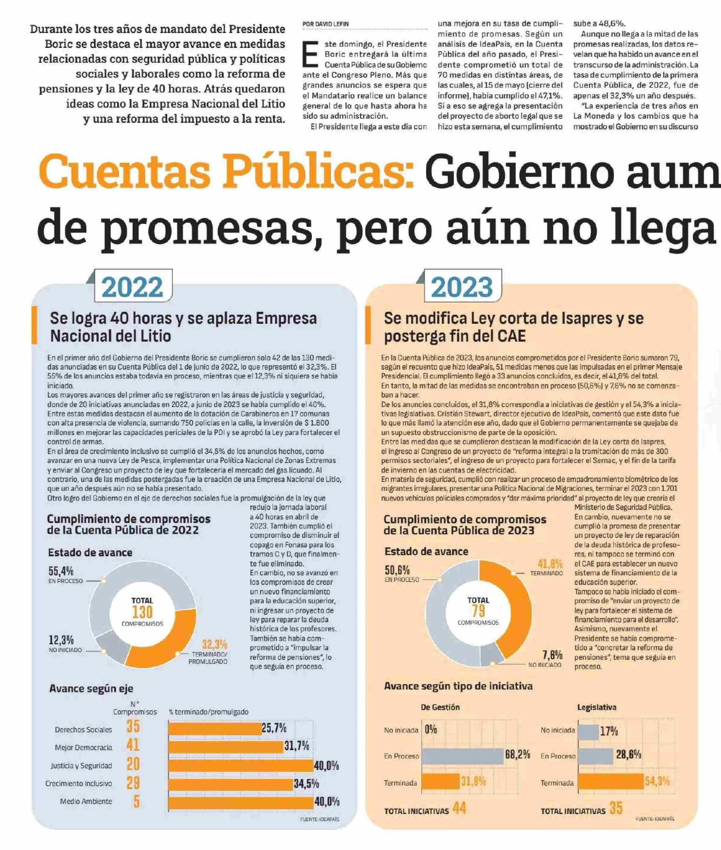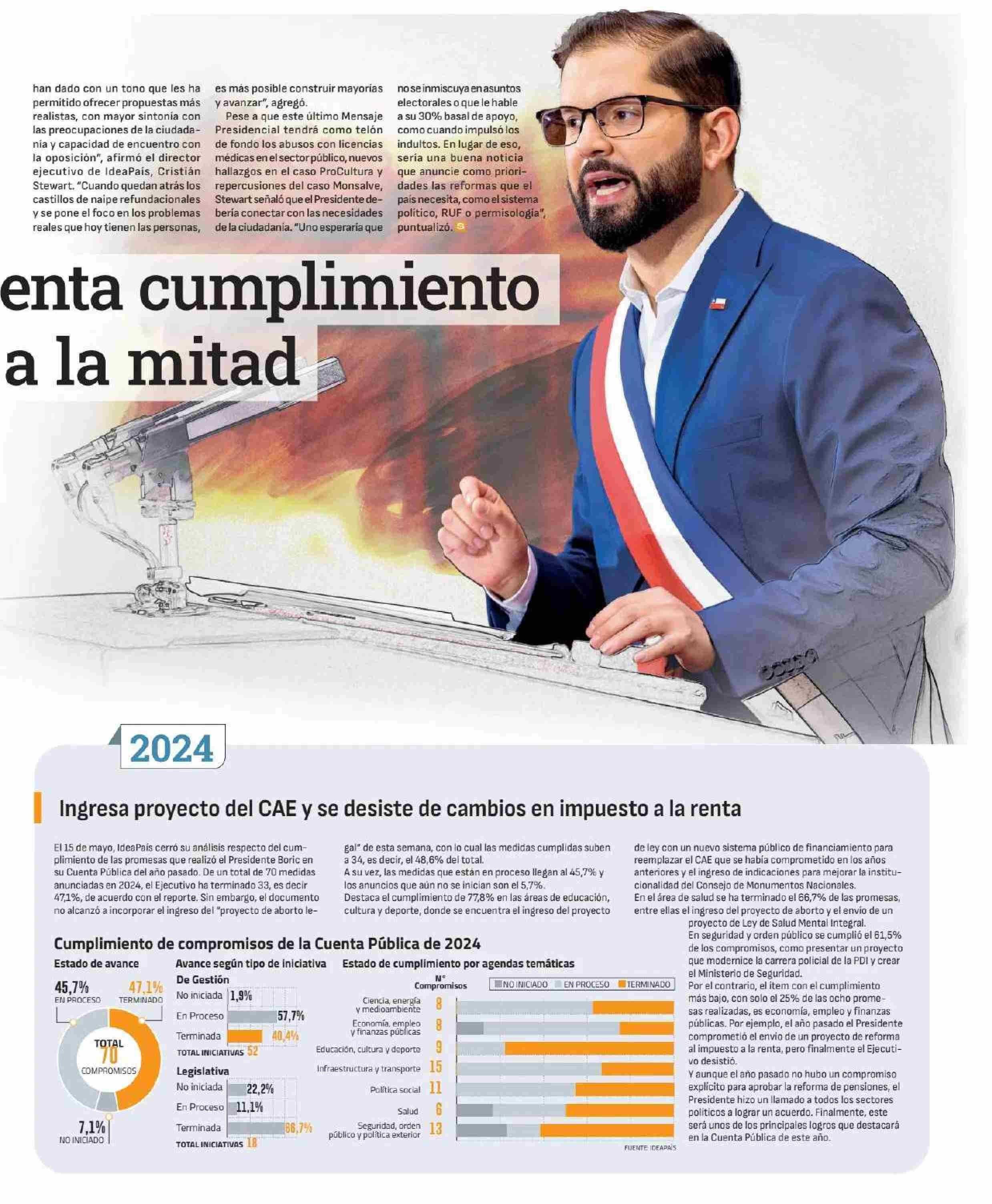 Cuentas Públicas: Gobierno aumenta cumplimiento de promesas, pero aún no llega a la mitad 31-05-2025 Diario Financiero |
