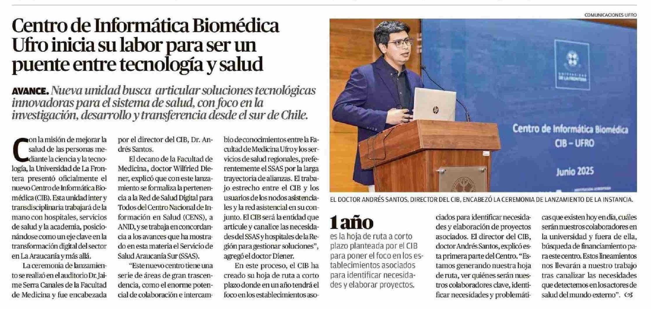 Centro de Informática Biomédica Ufro inicia su labor para ser un puente entre tecnología y salud 05-07-2025 El Austral de la Araucanía |