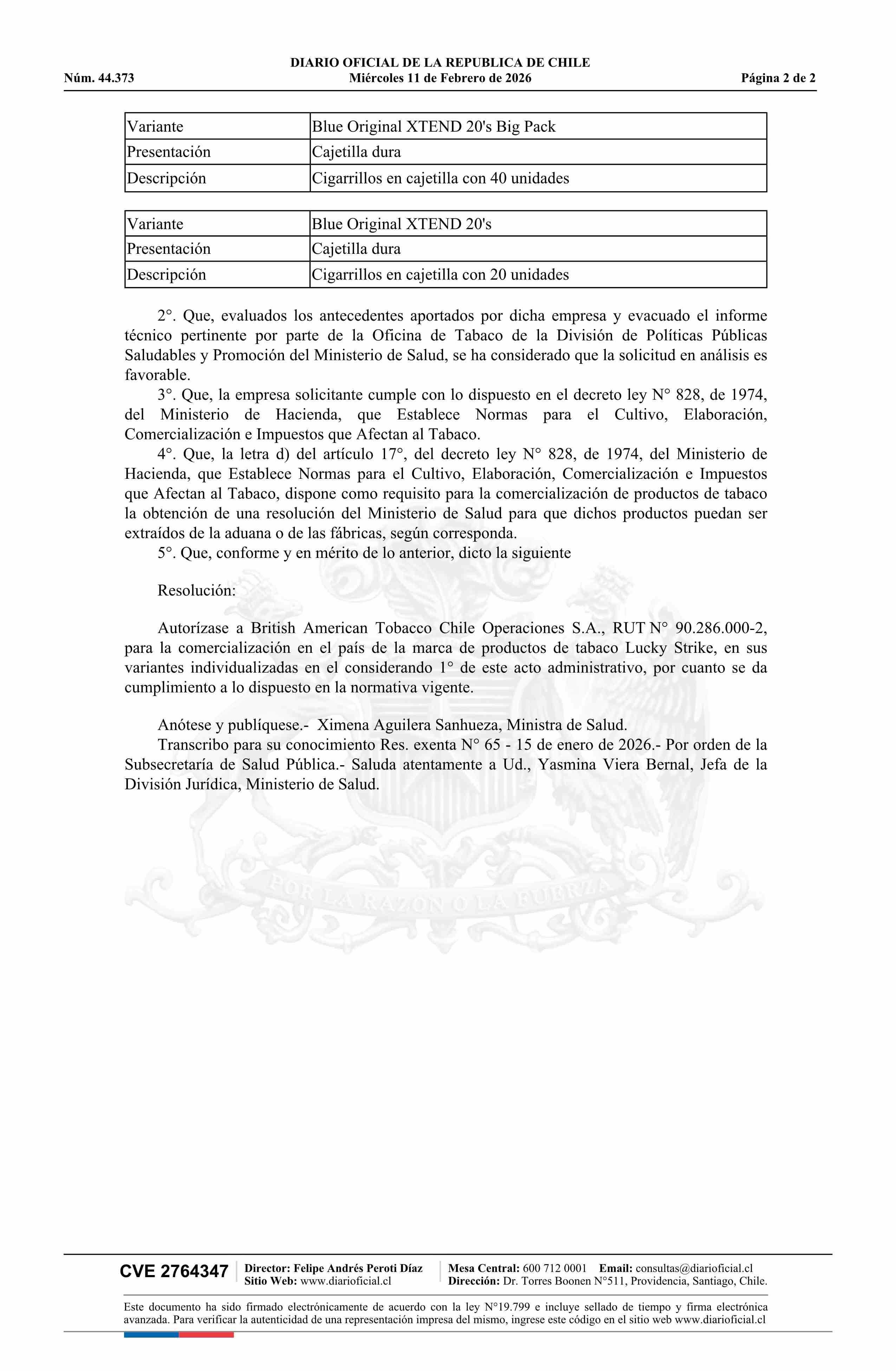 Resolución exenta número 65, de 2026.- Autoriza comercialización de productos de tabaco que indica comercializados por British American Tobacco Chile Operaciones S.A. 11-02-2026 Diario Oficial Edición Electrónica |