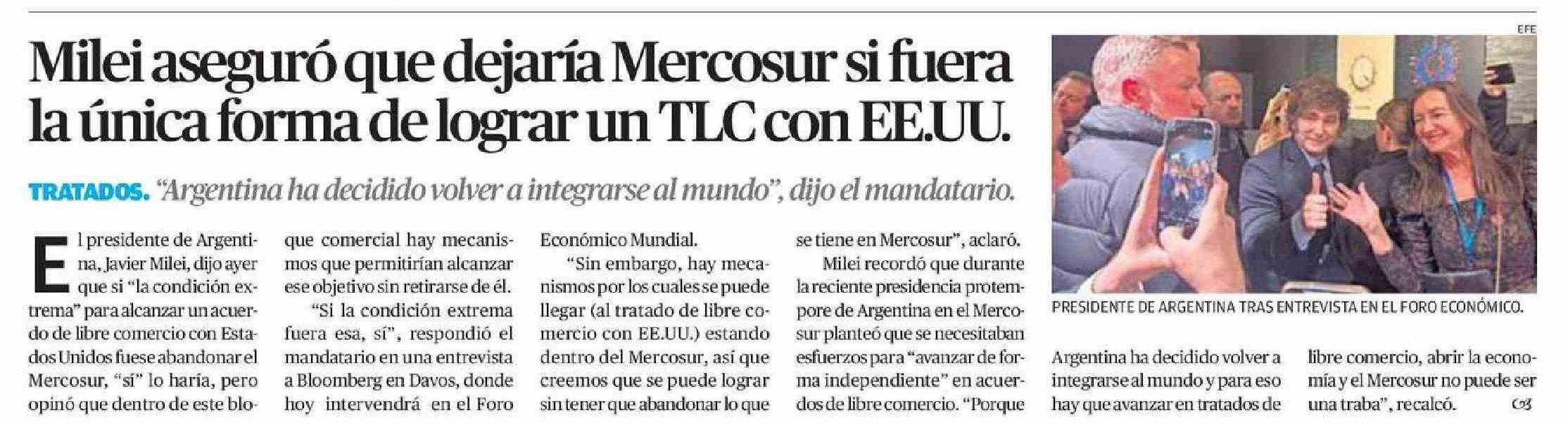 Milei aseguró que dejaría Mercosur si fuera la única forma de lograr un TLC con EEUU. 23-01-2025 El Mercurio de Calama |