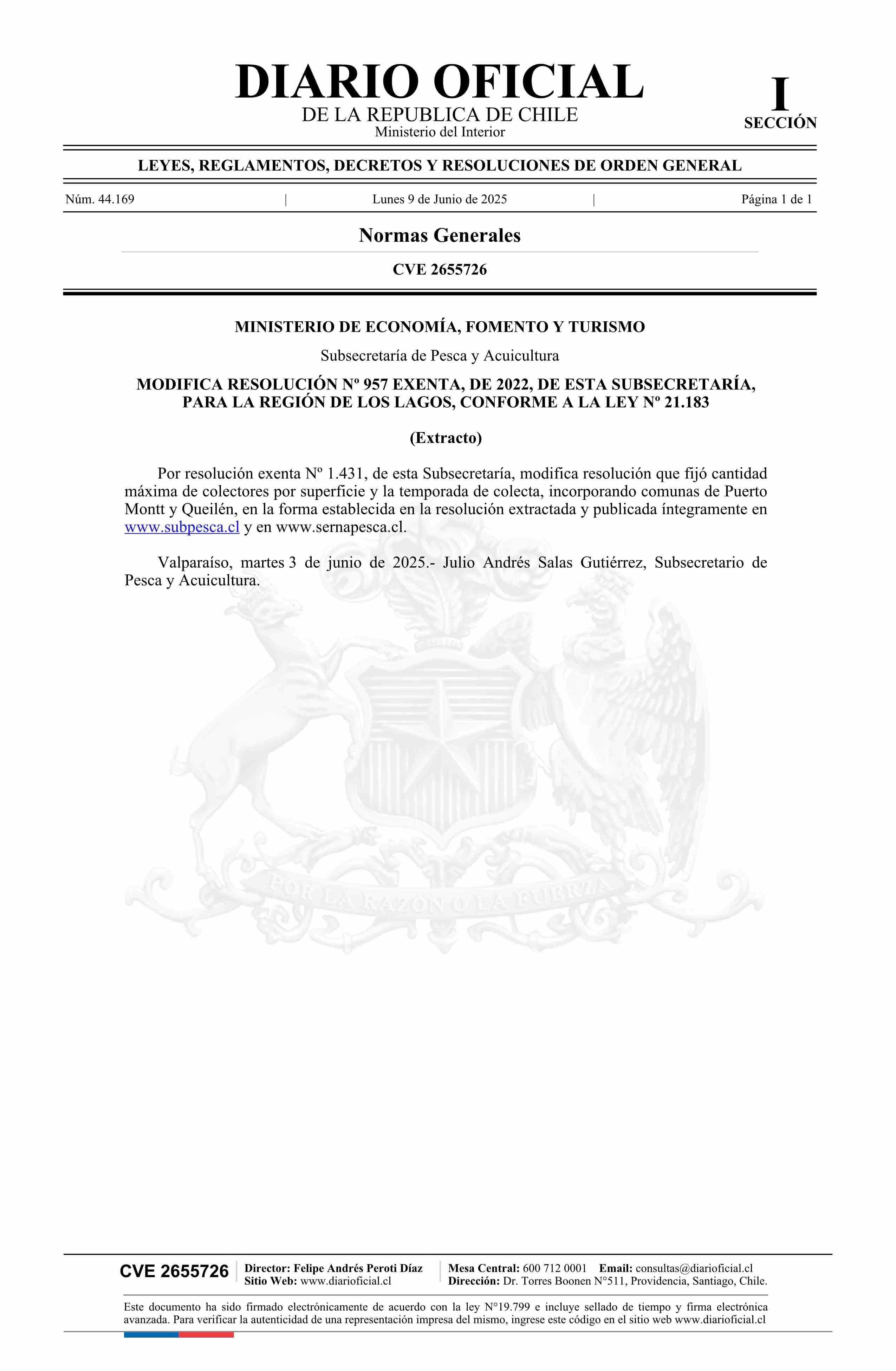 | Título: | Extracto de resolución exenta número 1.431, de 2025.- Modifica resolución Nº 957 exenta, de 2022, para la Región de Los Lagos, conforme a la ley Nº 21.183 |