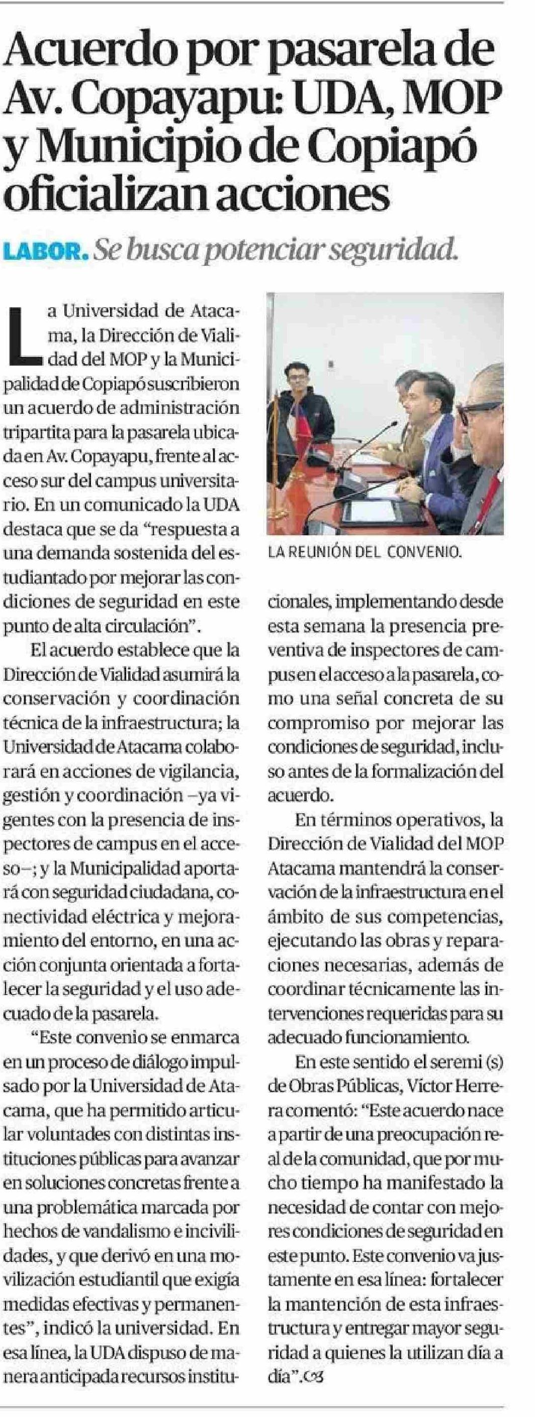 Acuerdo por pasarela de Av. Copayapu: UDA, MOP y Municipio de Copiapó oficializan acciones 25-04-2026 El Diario de Atacama |