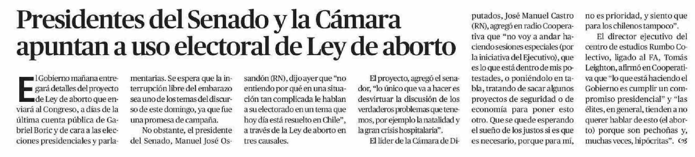 Presidentes del Senado y la Cámara apuntan a uso electoral de Ley de aborto 27-05-2025 El Mercurio de Calama |