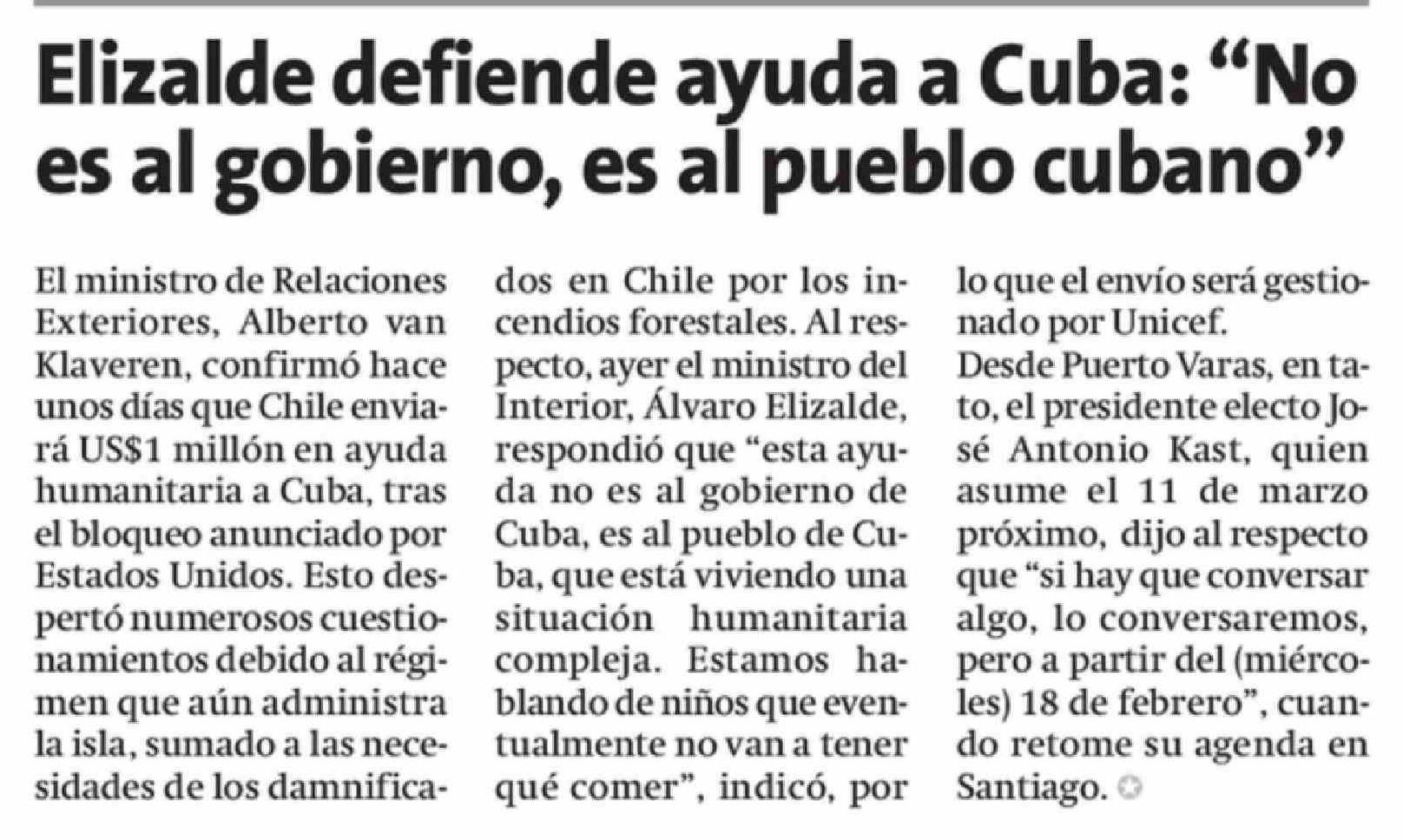 Elizalde defiende ayuda a Cuba: "No es al gobierno, es al pueblo cubano" 16-02-2026 La Estrella de Concepción |