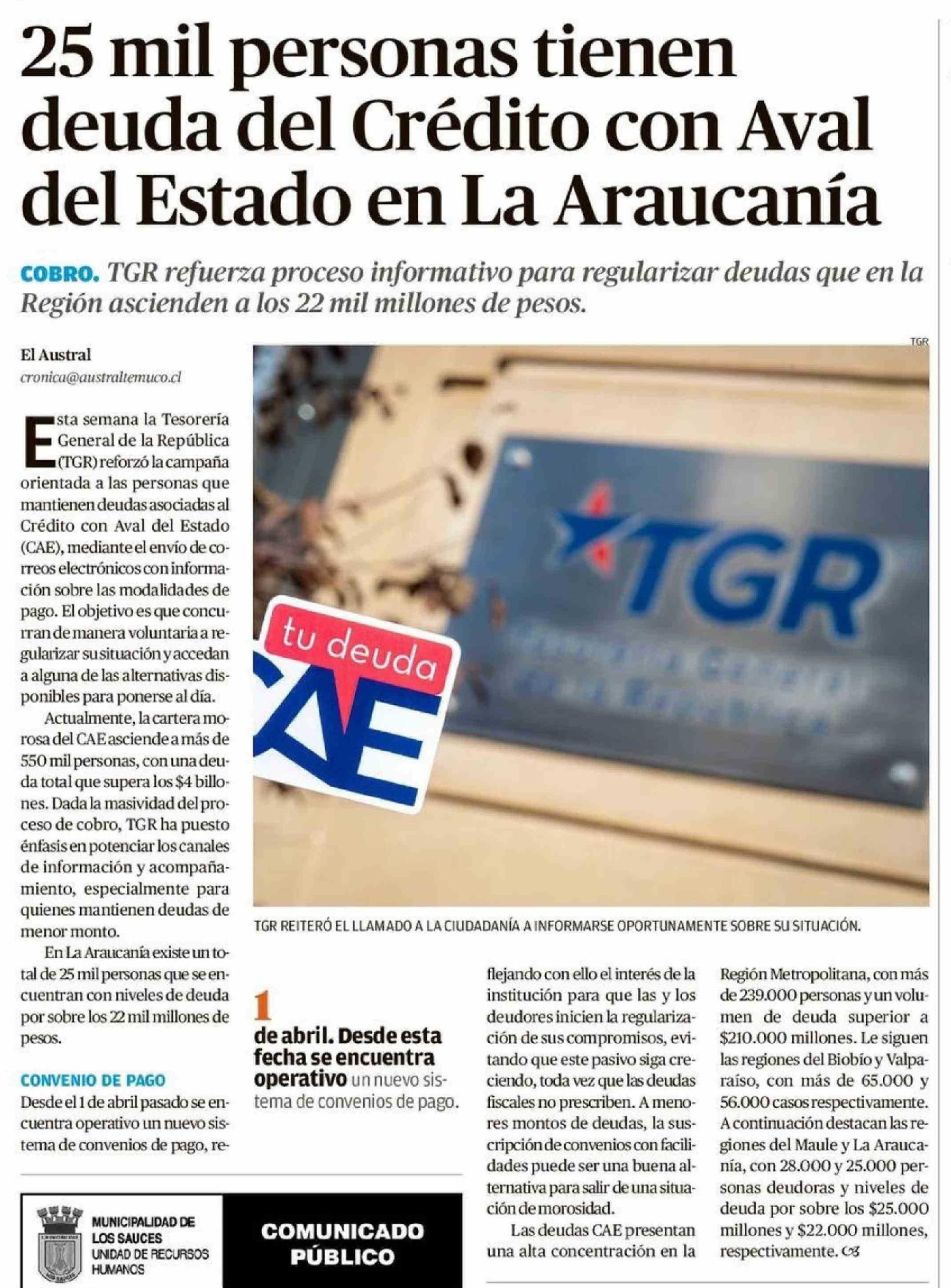 25 Mil personas tienen deuda del Crédito con Aval del Estado en La Araucanía 17-04-2026 El Austral de la Araucanía |