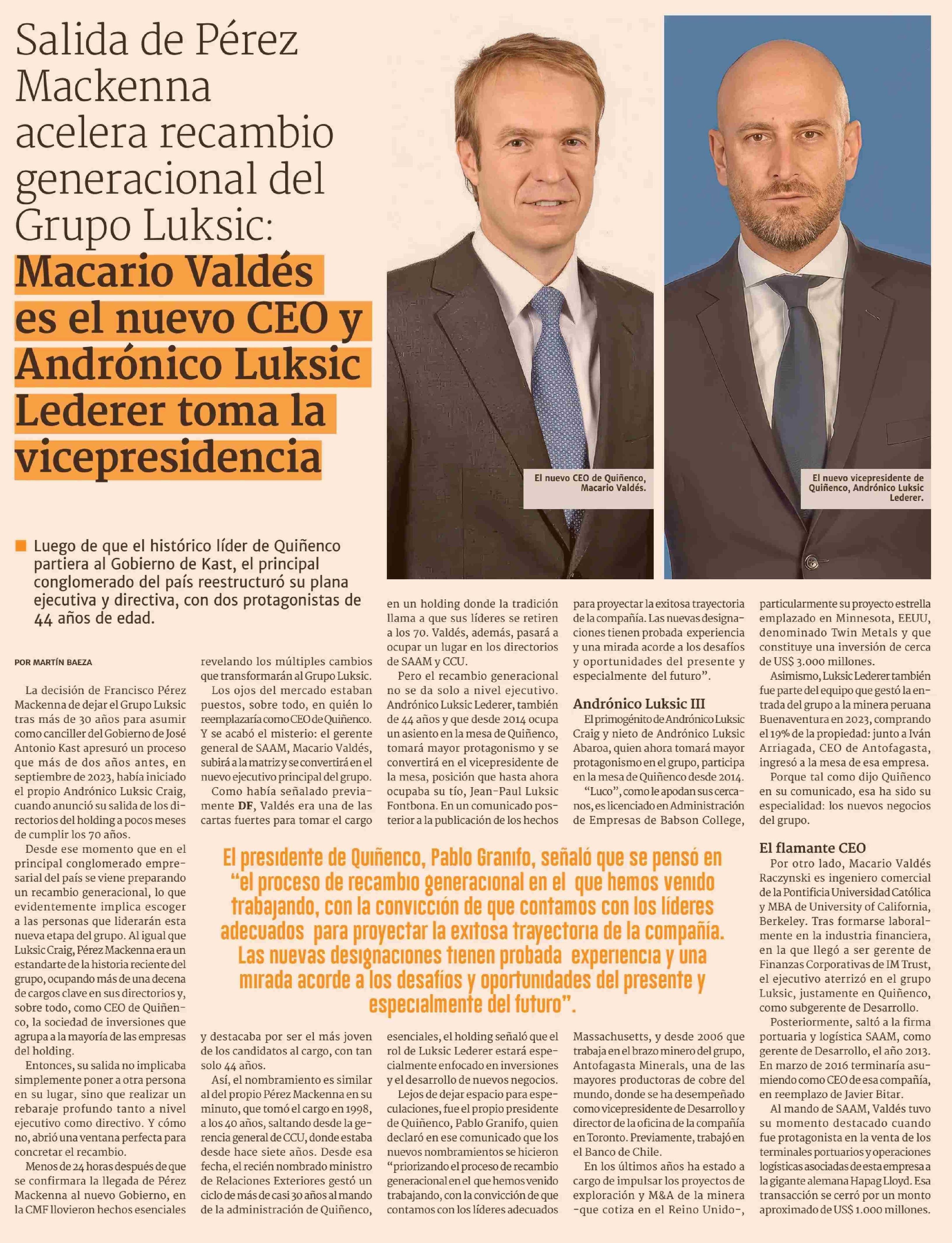 | Título: | Salida de Pérez Mackenna acelera recambio generacional del Grupo Luksic: Macario Valdés es el nuevo CEO y Andrónico Luksic Lederer toma la vicepresidencia |