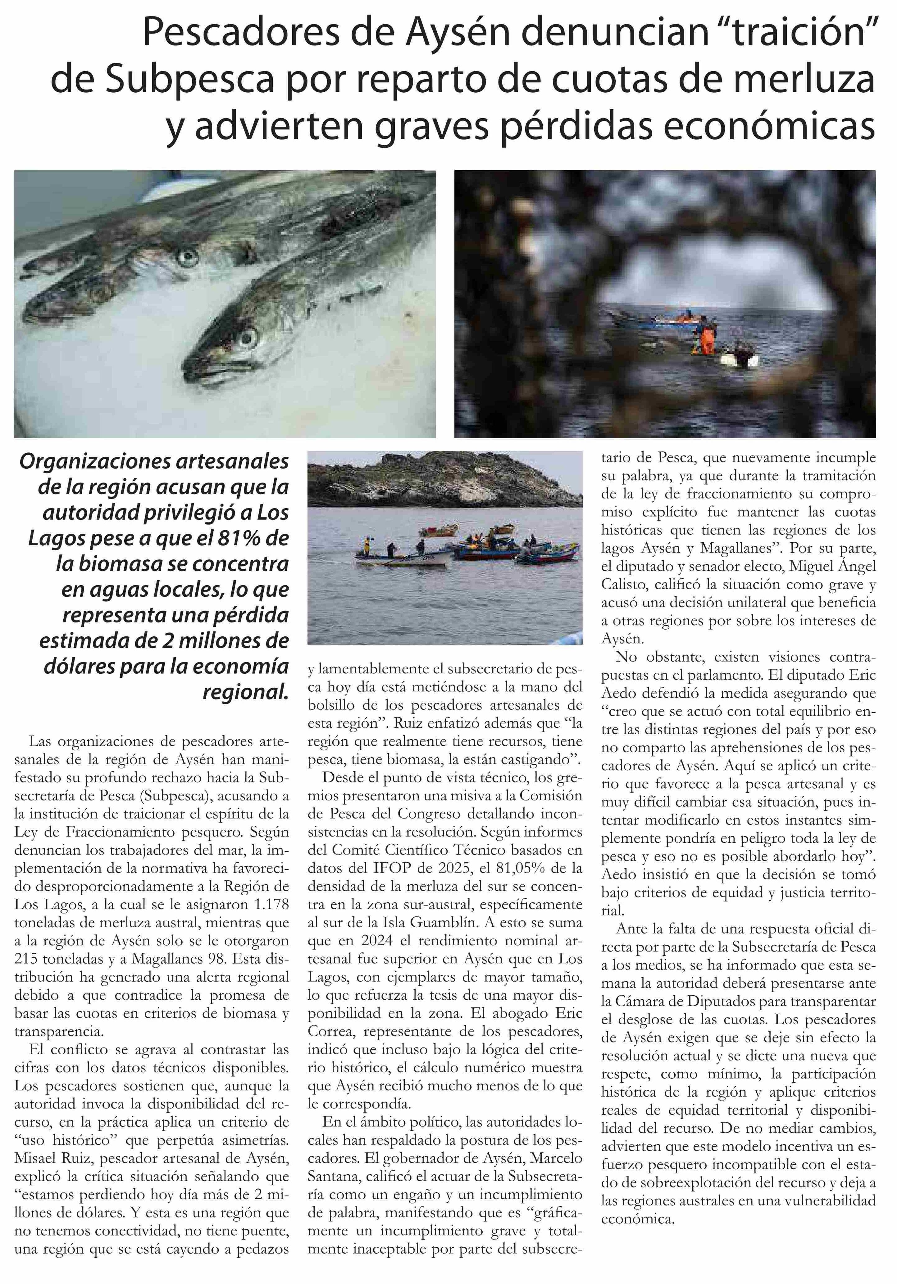 Título: Pescadores de Aysén denuncian "traición" de Subpesca por reparto de cuotas de merluza y advierten graves pérdidas económicas