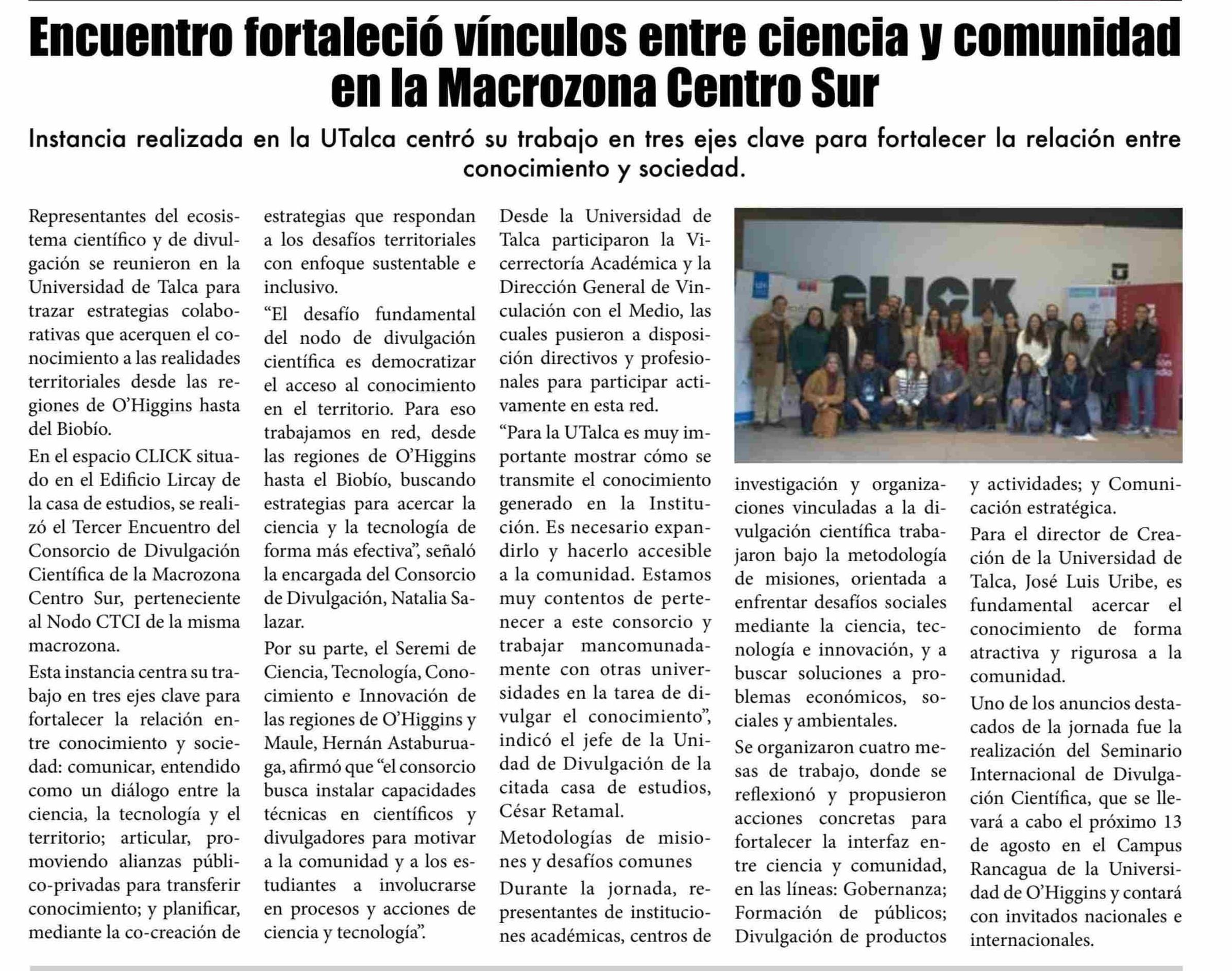 Encuentro fortaleció vínculos entre ciencia y comunidad en la Macrozona Centro Sur 17-06-2025 El Lector |
