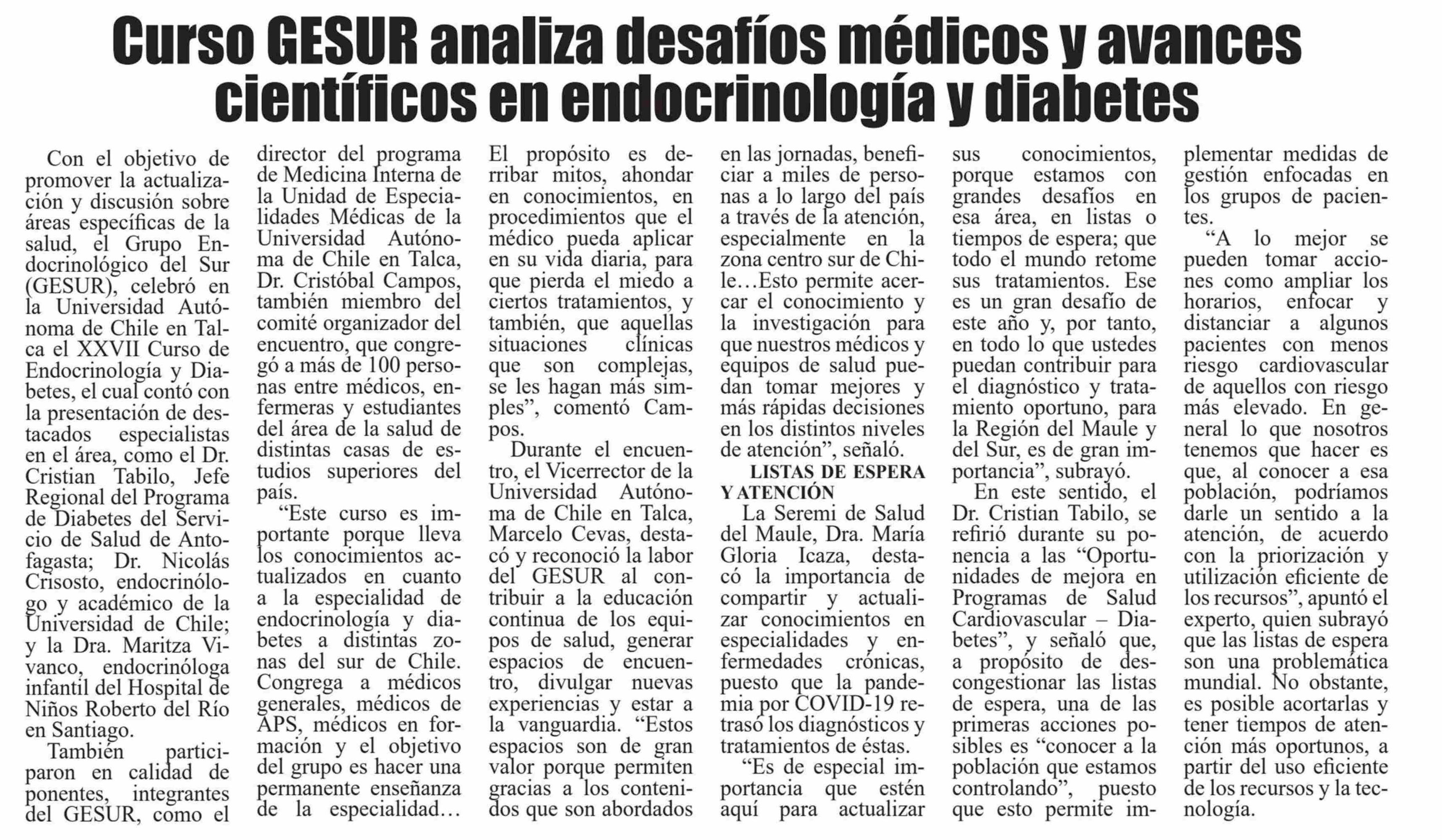 | Título: | Curso GESUR analiza desafíos médicos y avances científicos en endocrinología y diabetes |
