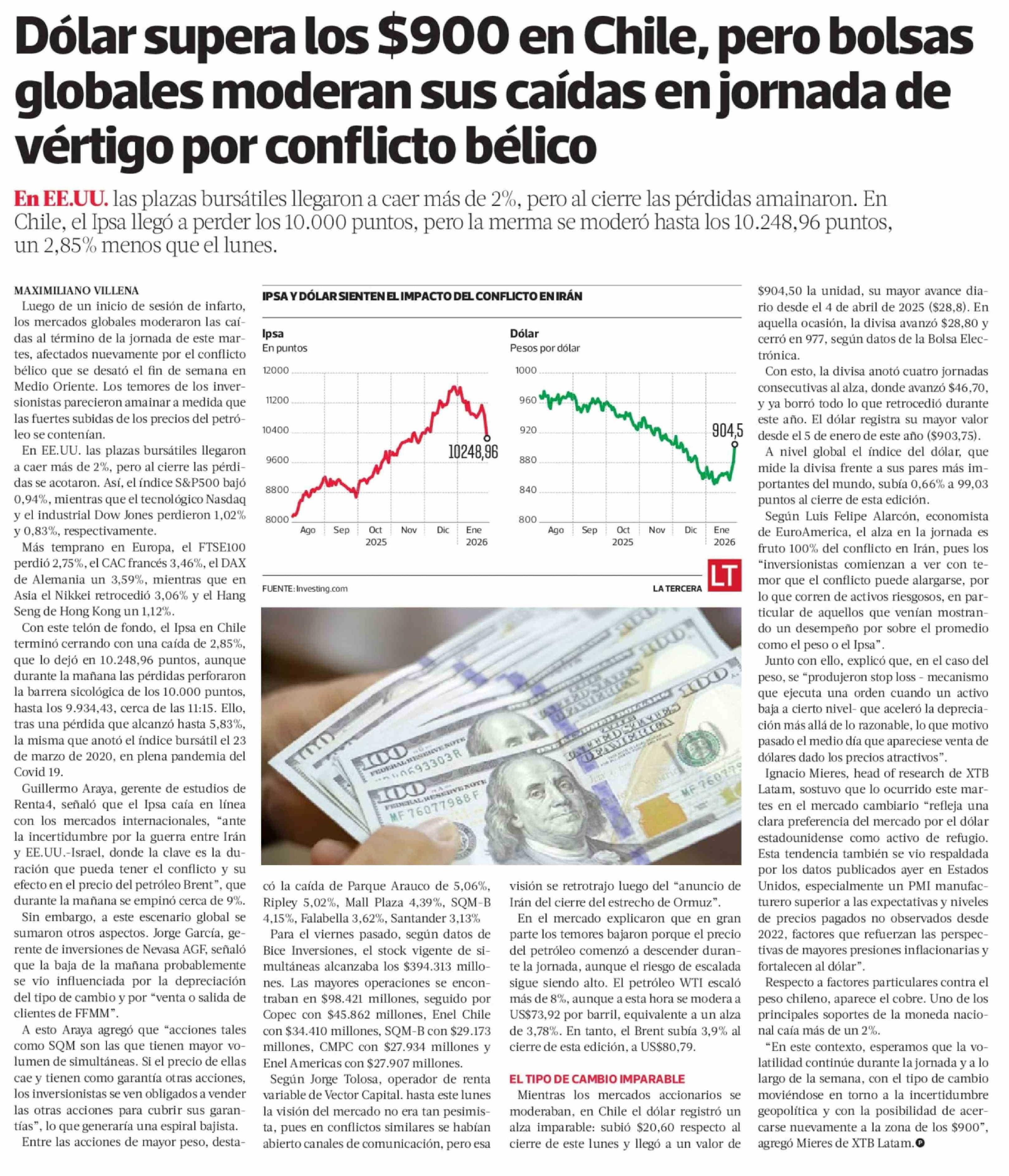 Dólar supera los $900 en Chile, pero bolsas globales moderan sus caídas en jornada de vértigo por conflicto bélico 04-03-2026 La Tercera |