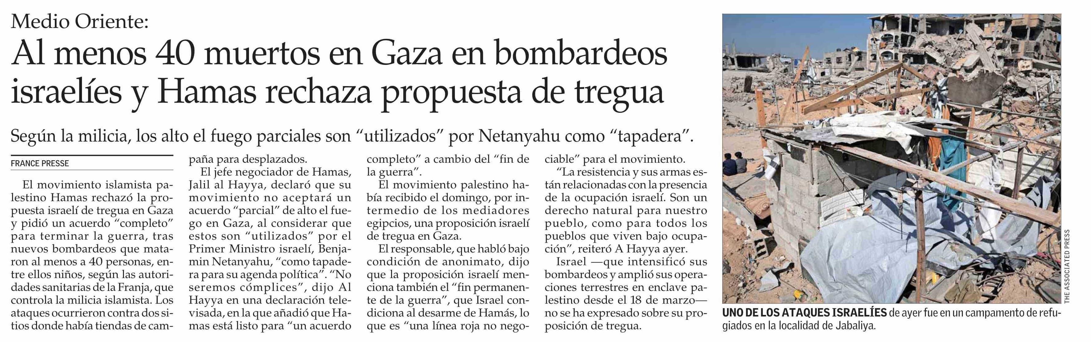 | Título: | Al menos 40 muertos en Gaza en bombardeos israelíes y Hamas rechaza propuesta de tregua |