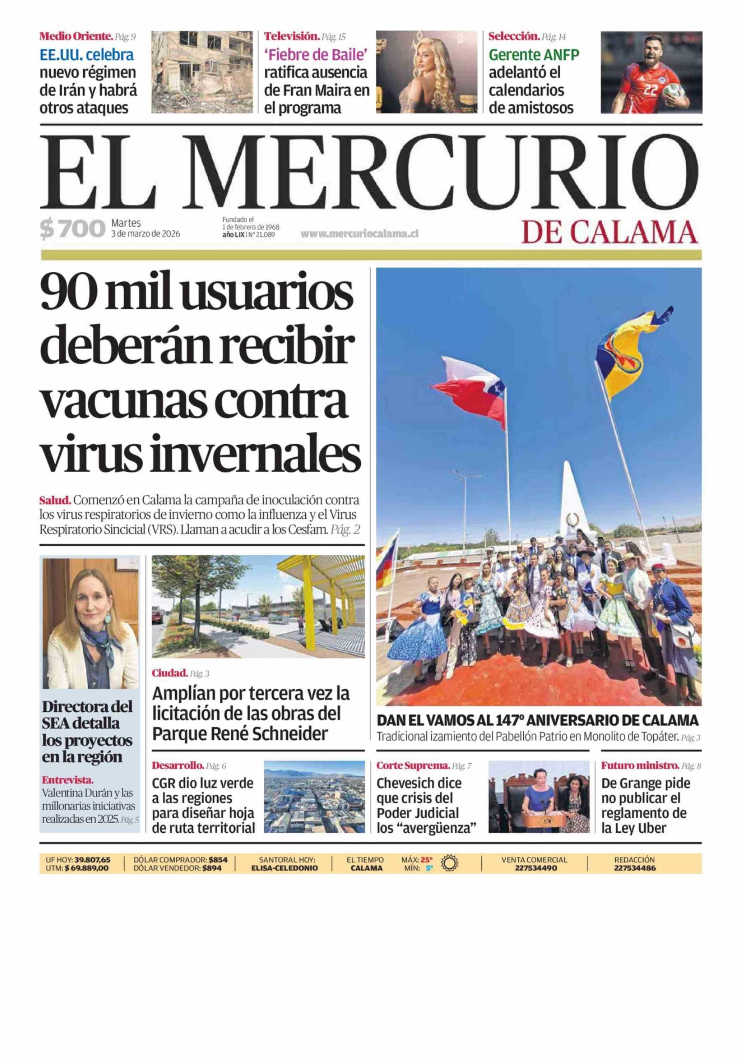 PORTADA EL MERCURIO DE CALAMA CHILE 03-03-2026 El Mercurio de Calama |